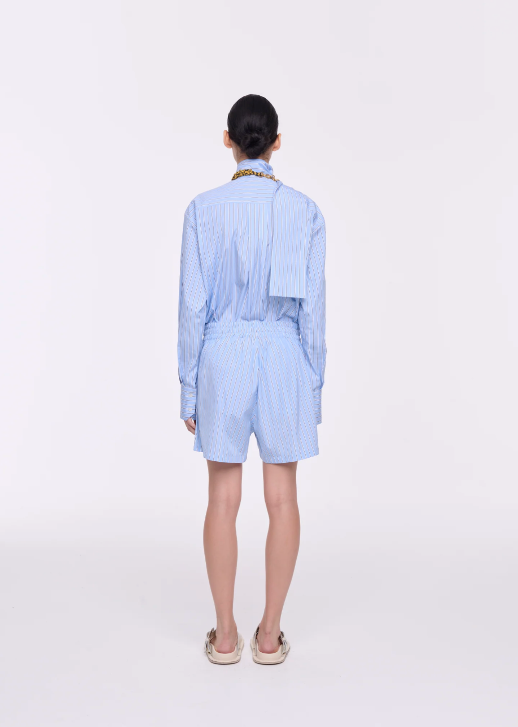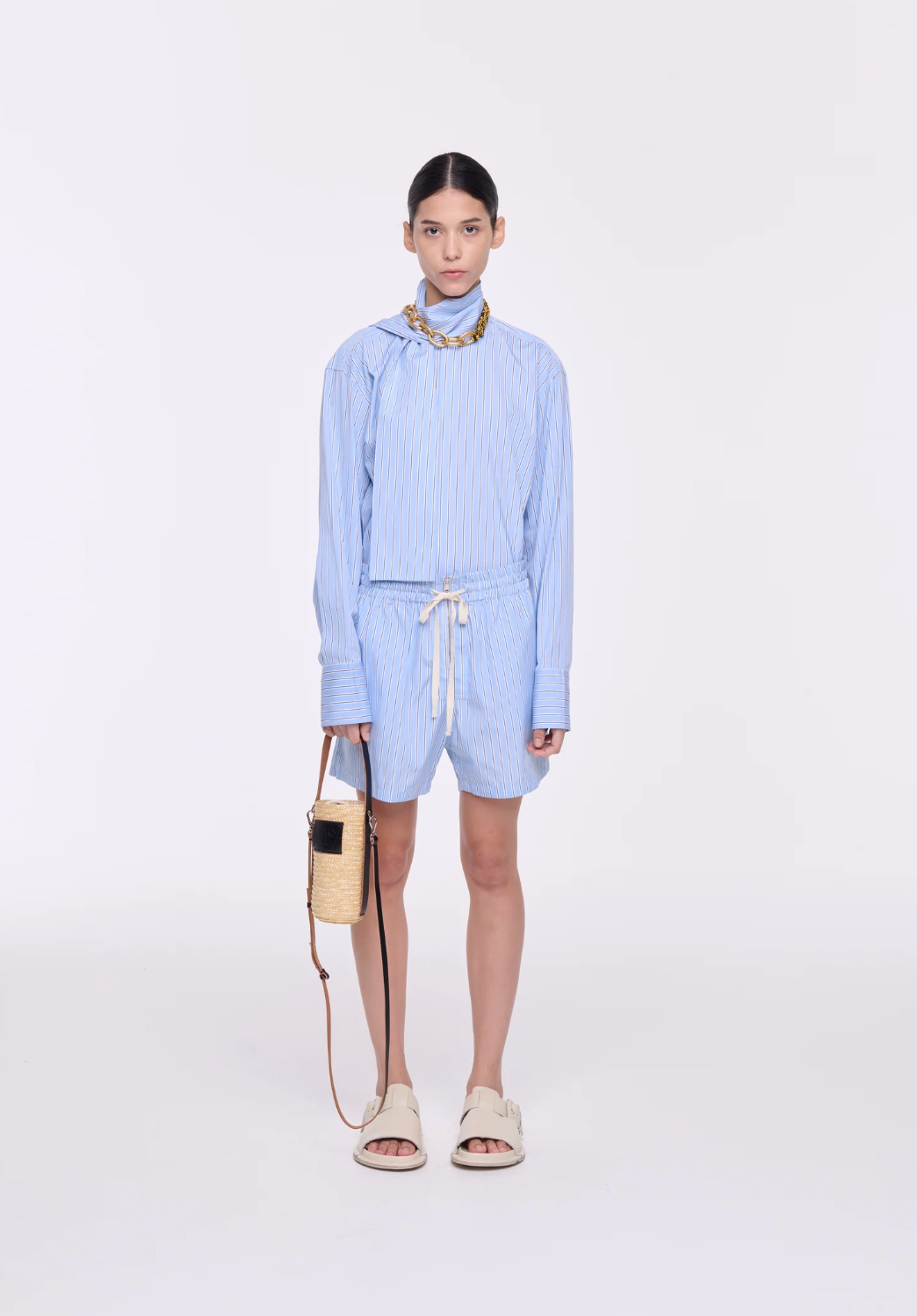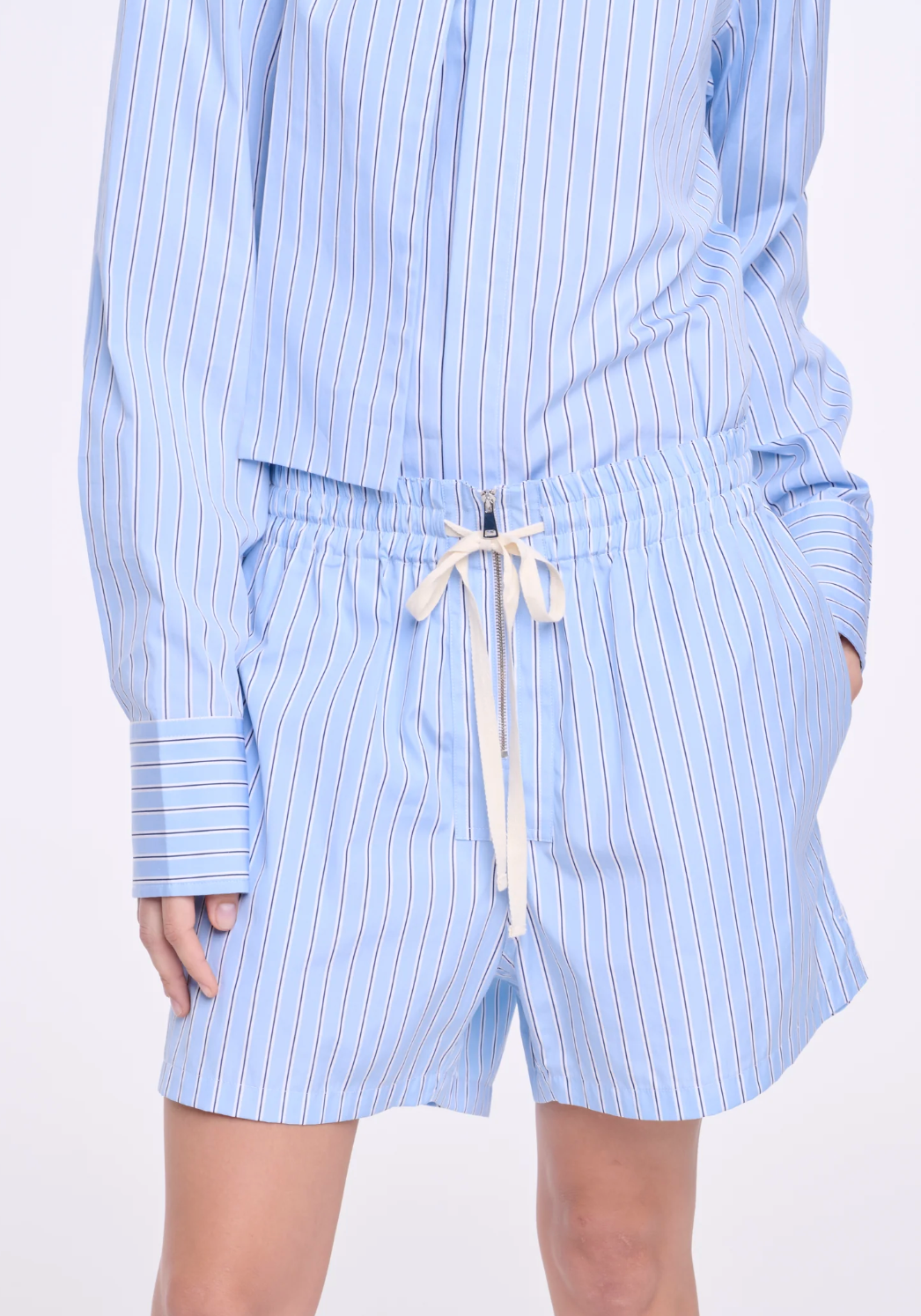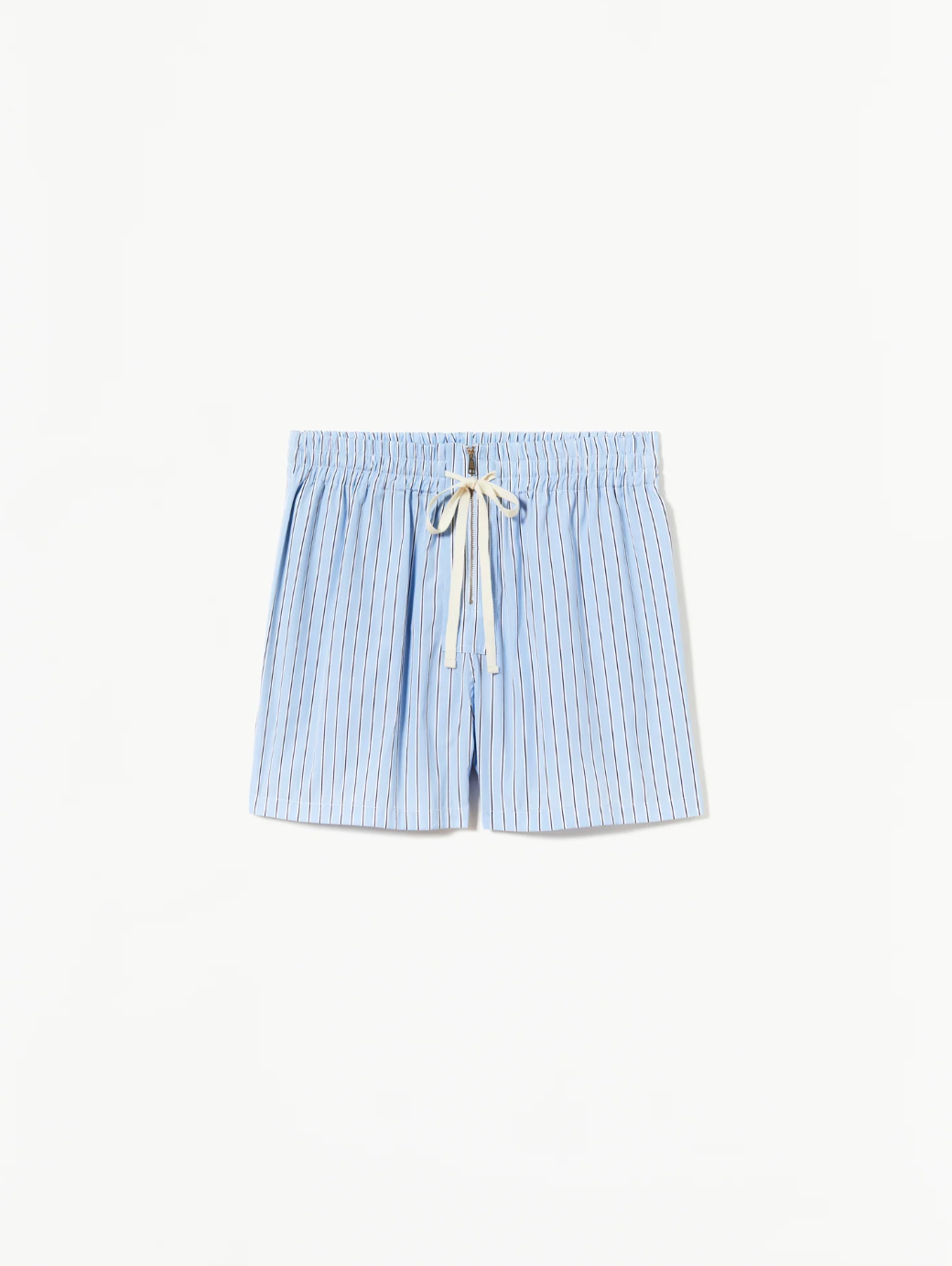 Light blue, blue and white striped cotton bermuda with front zip and elasticaed drawstring waist. Side slip pockets and regular waist.