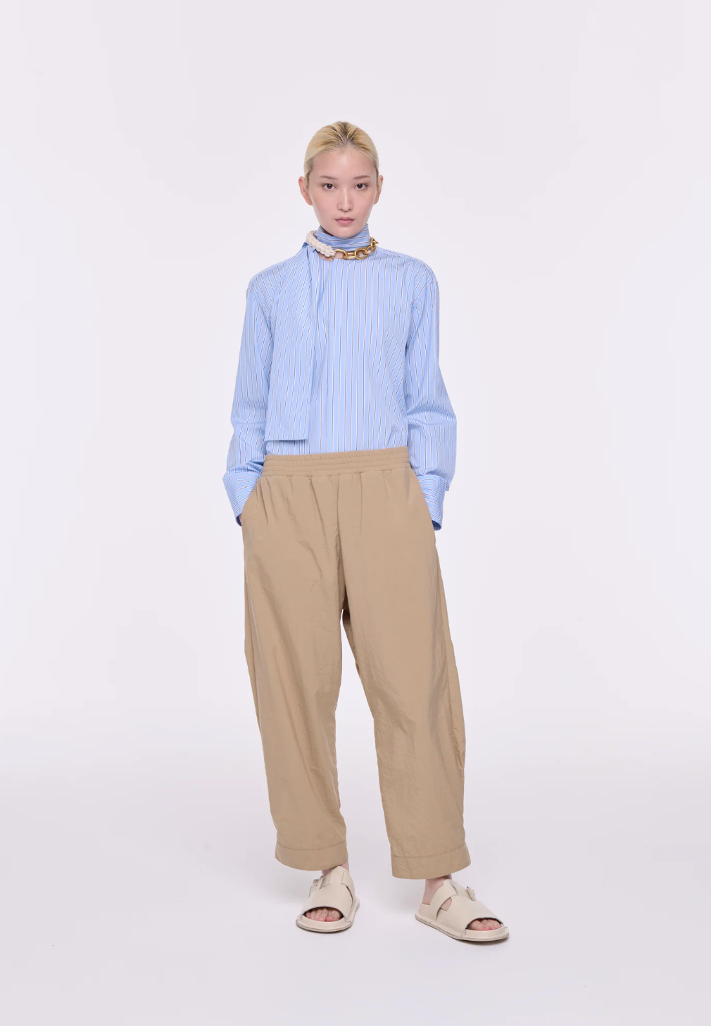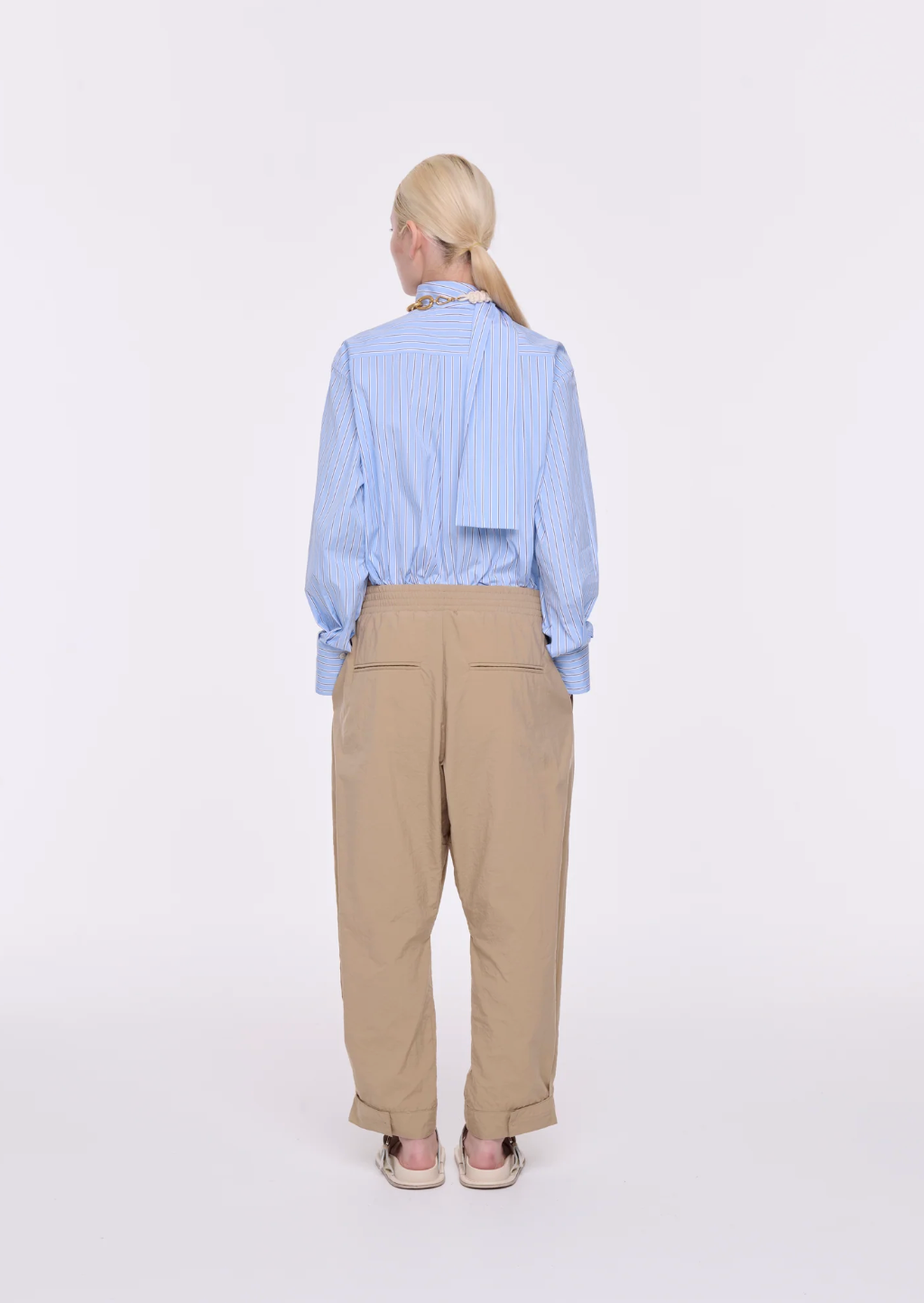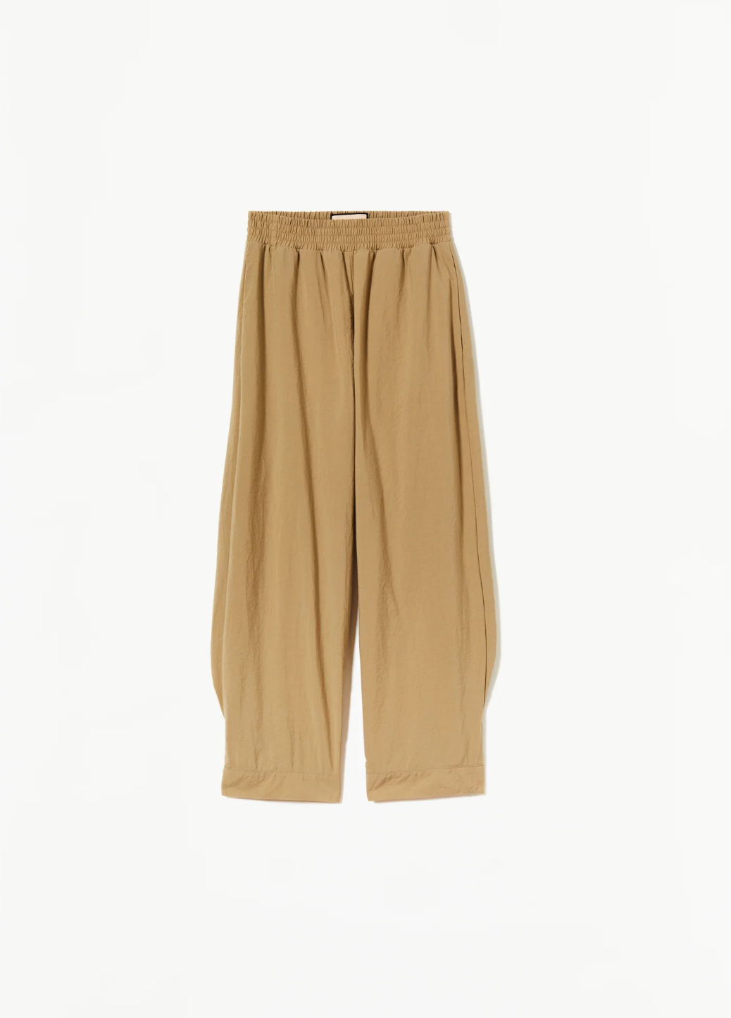 Elasticated wide trousers in technical panama. Regular waist. Side slip pockets, back welt pockets. Velcro fastening on the ankle.