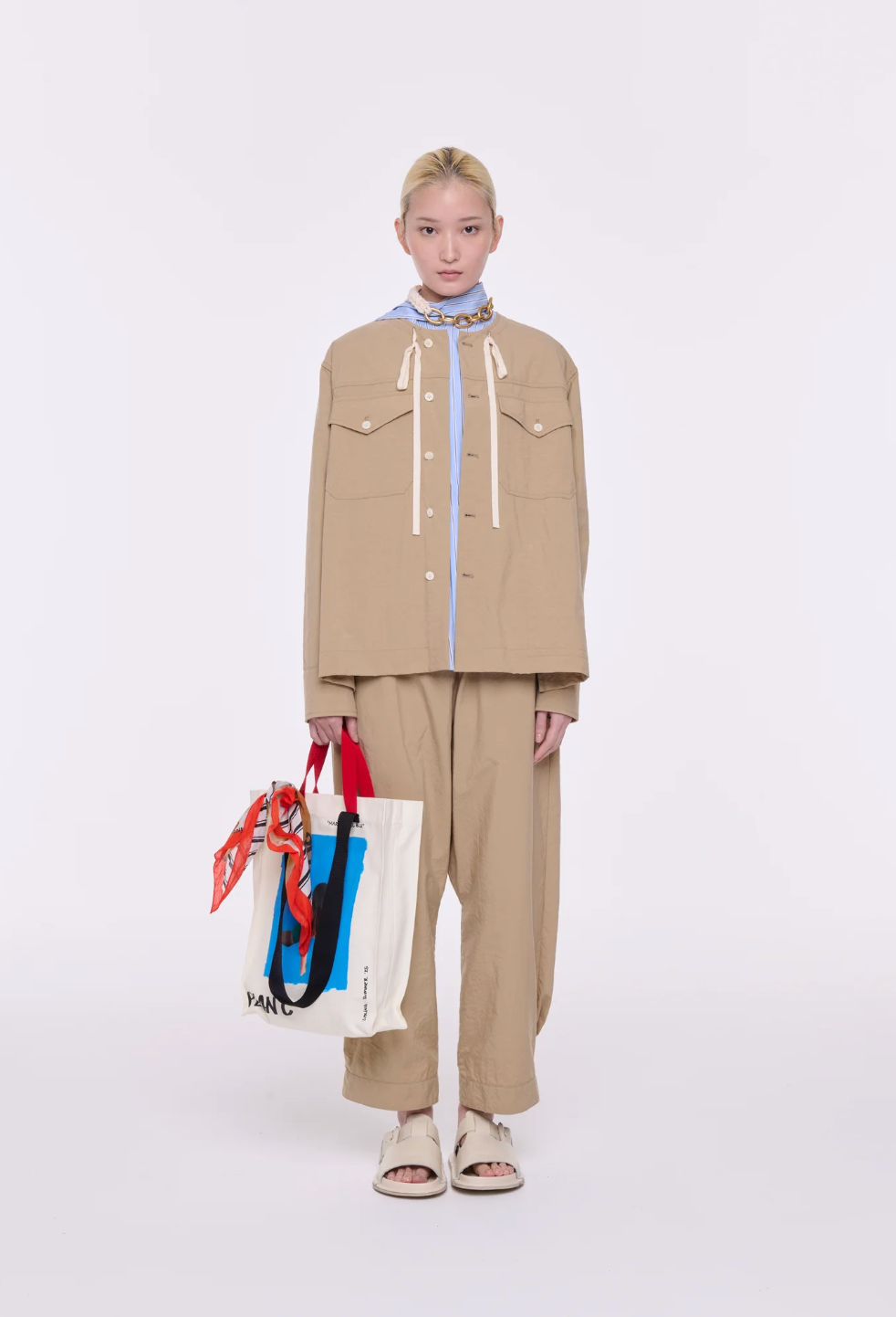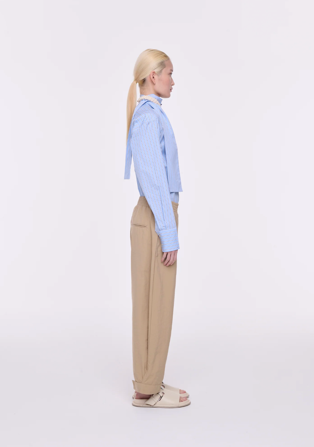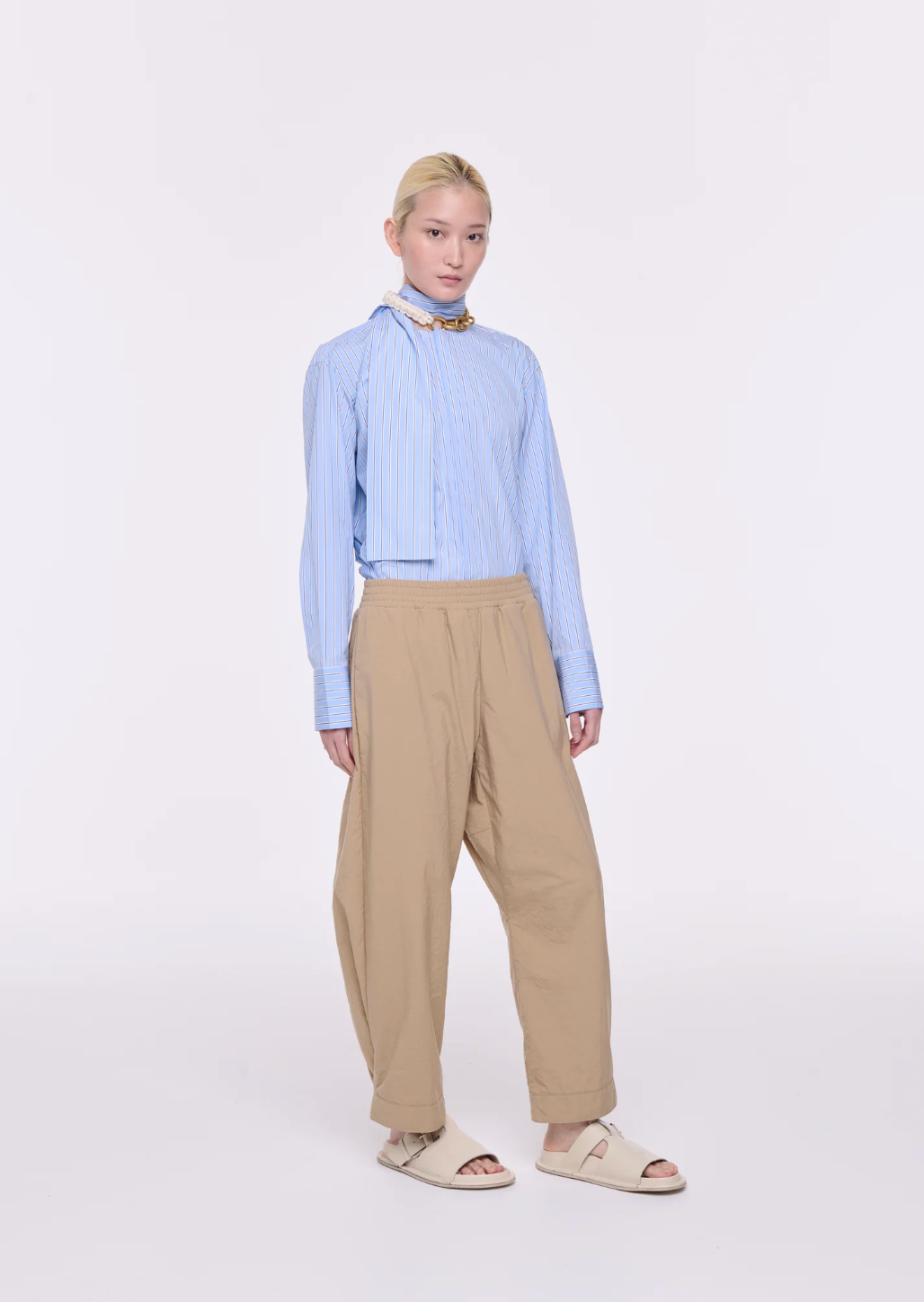Elasticated wide trousers in technical panama. Regular waist. Side slip pockets, back welt pockets. Velcro fastening on the ankle.