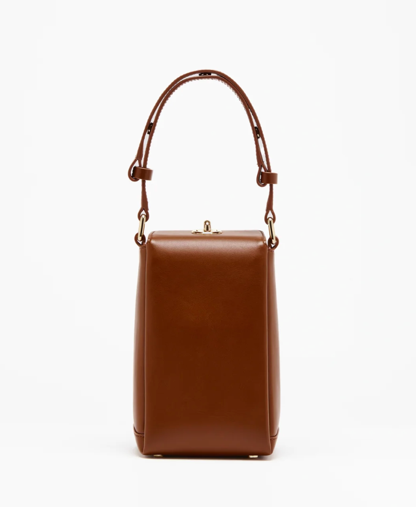 The iconic Folded women's bag expands with new colors and styles. This toasted calfskin Camera Bag with adjustable leather strap features 3 compartments and 2 small internal pockets. Gold-toned turnstile top closure.