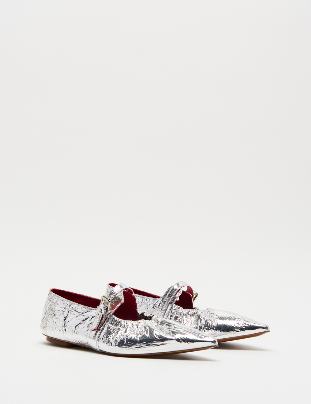 Silver leather pointed toe ballet flats with bucKled strap.Flat leather soles.