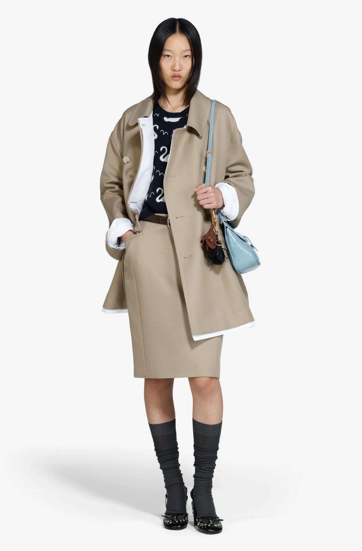 Double-breasted jacket in soft stone hue with refined hem detailing. A timeless silhouette that effortlessly elevates any wardrobe with understated sophistication.