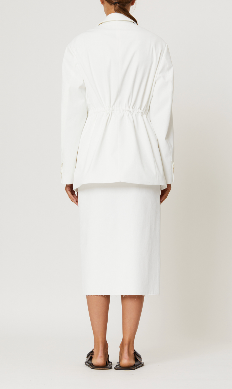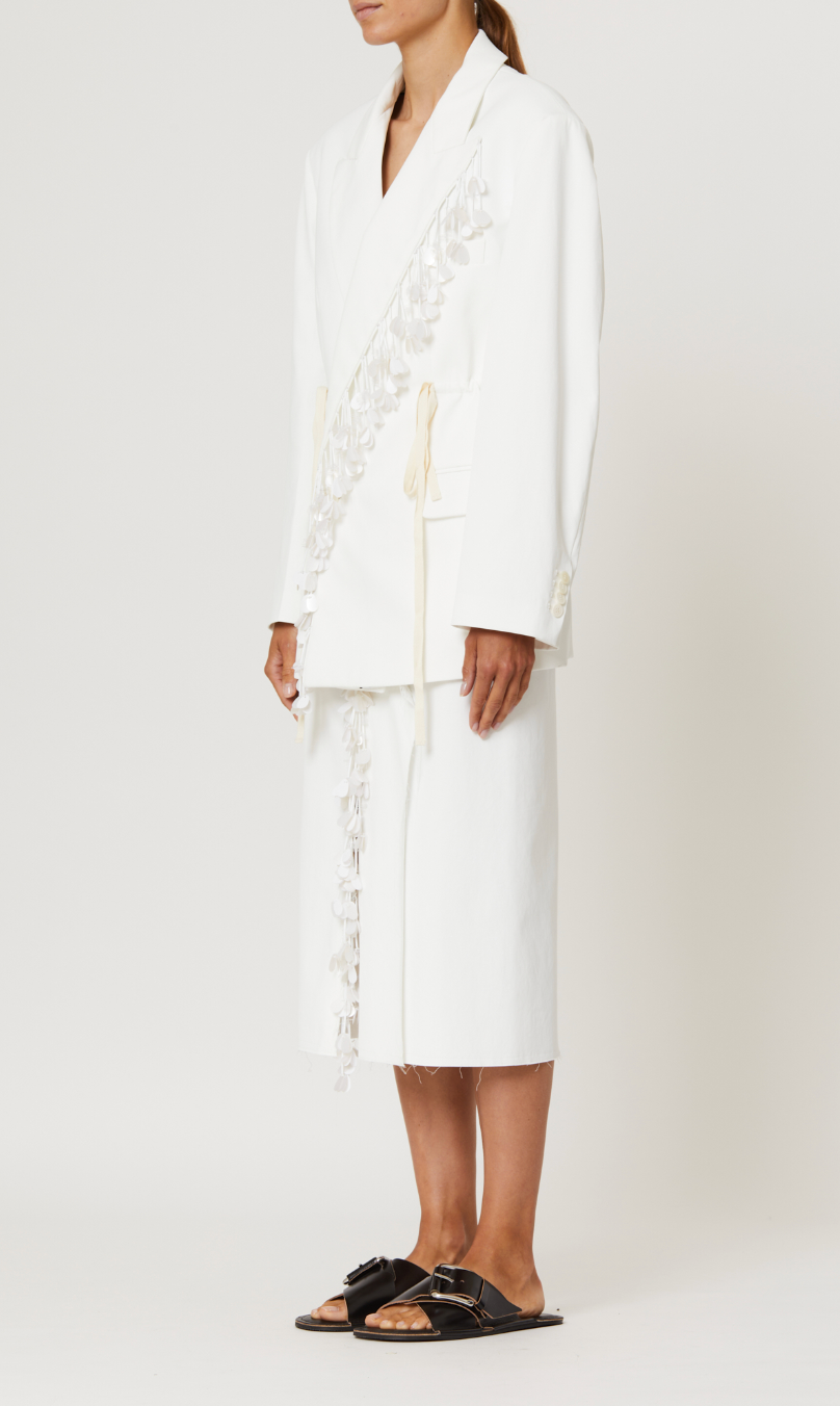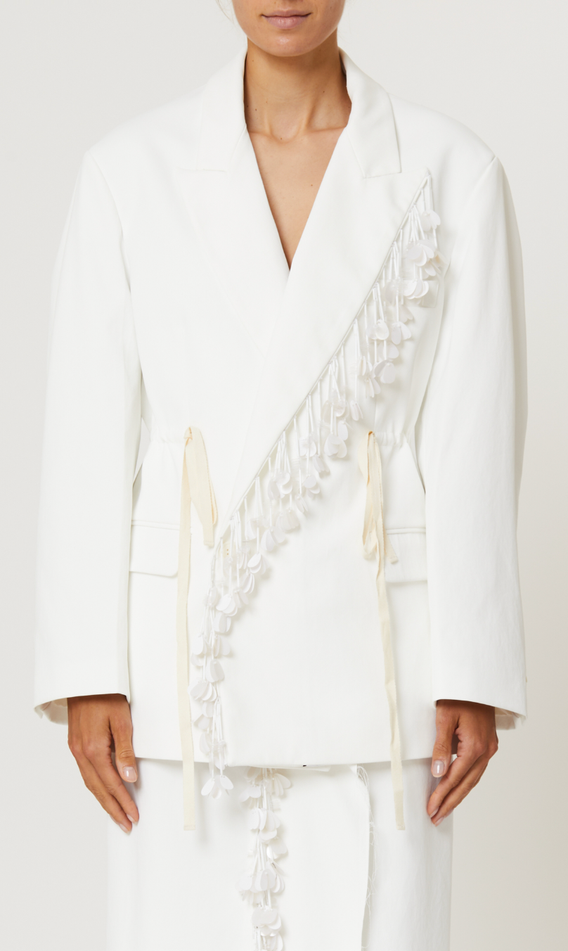 Double-breasted white chalk blazer with embroidered sequin fringes on the jacket lapel. Long sleeves and buttoned cuffs. Cotton drawstring, chest welt pocket and flap low pockets.