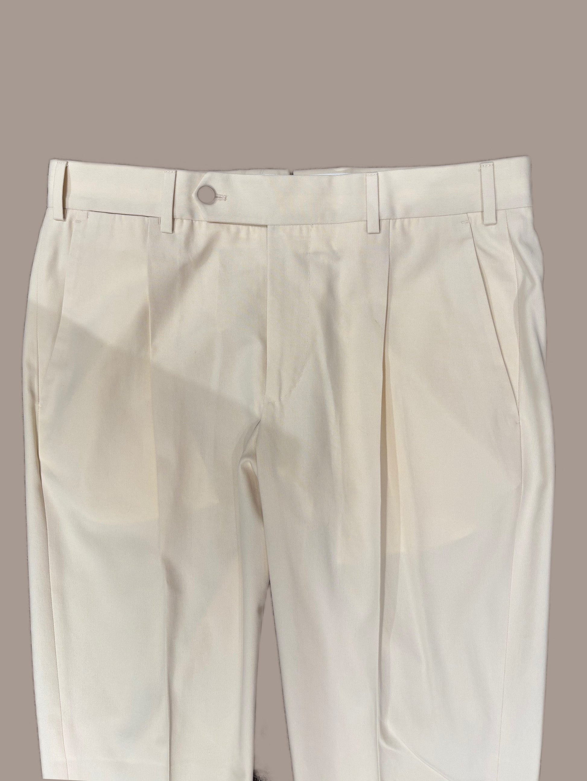 Ivory carrot-cut trousers in soft cotton twill. Structured pleats and diagonal pockets deliver polished style with practical ease.