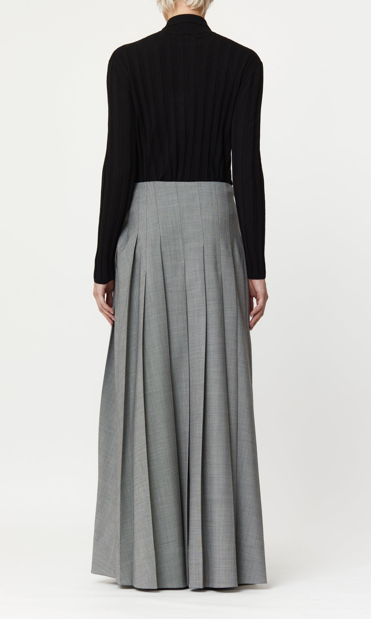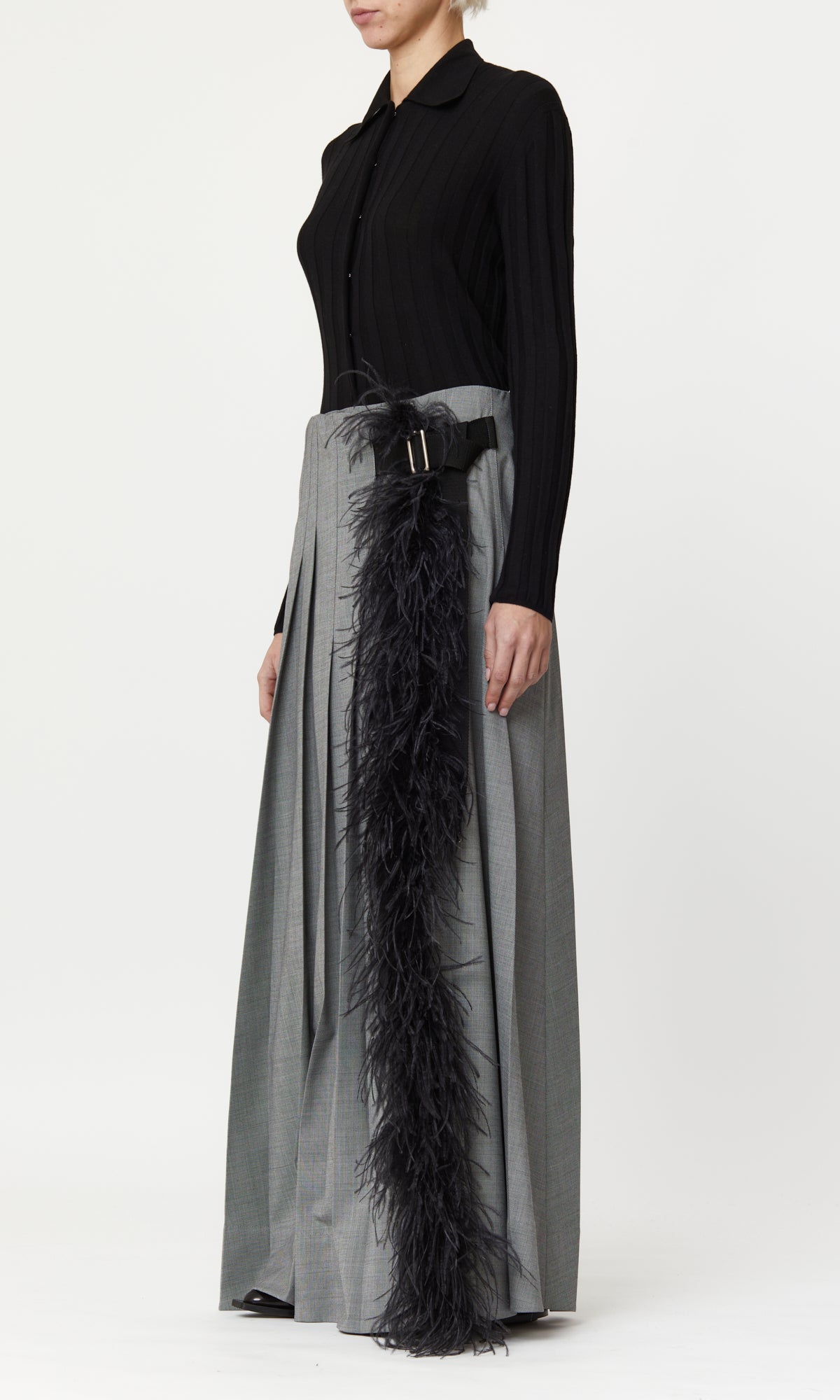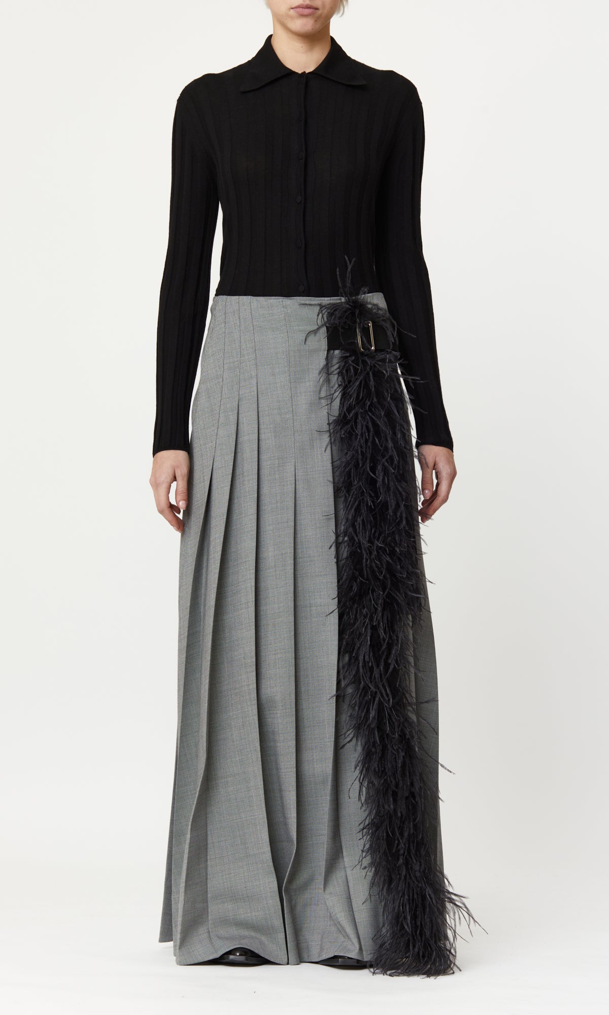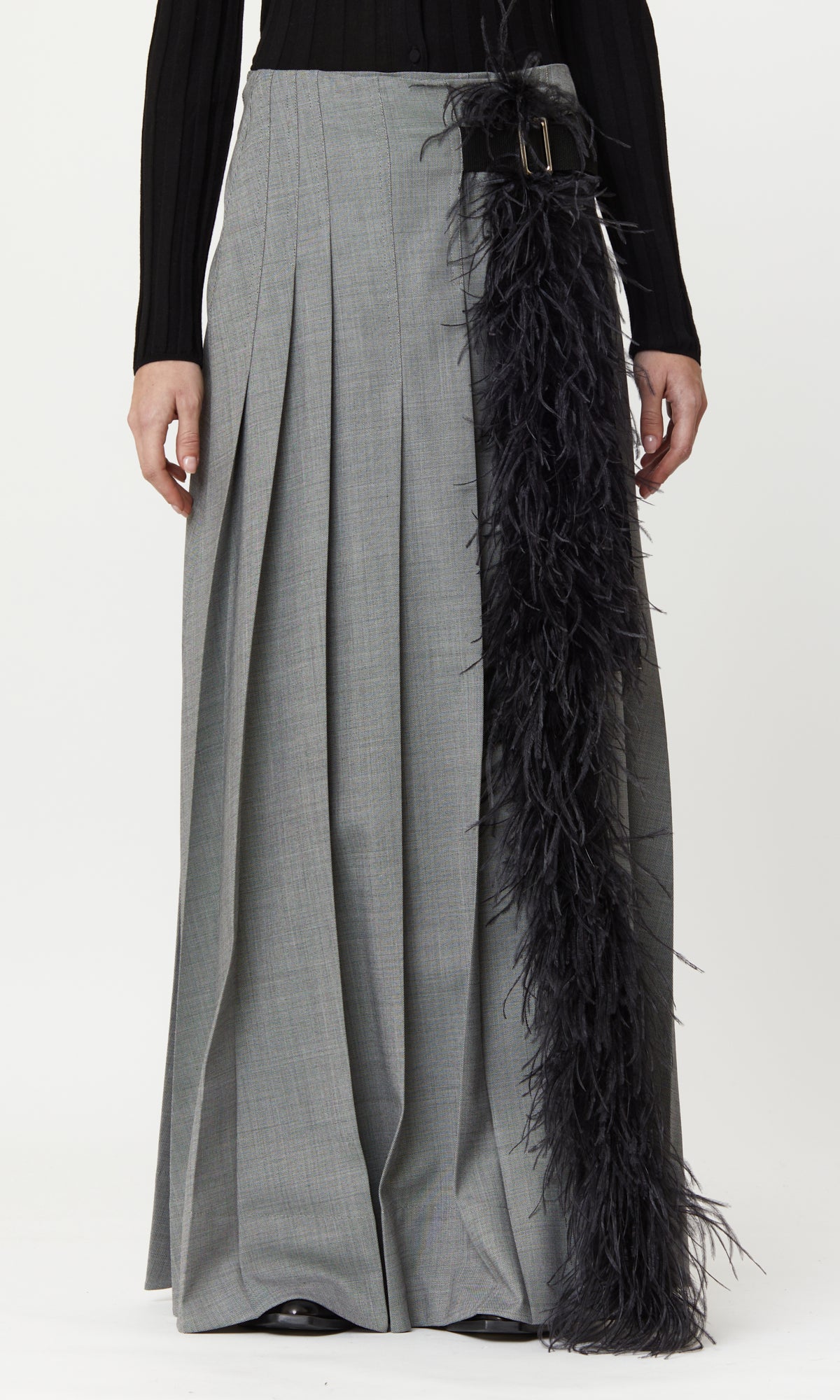 This long grey skirt with a removable feather detail is a true eye-catcher, proudly made in Italy.