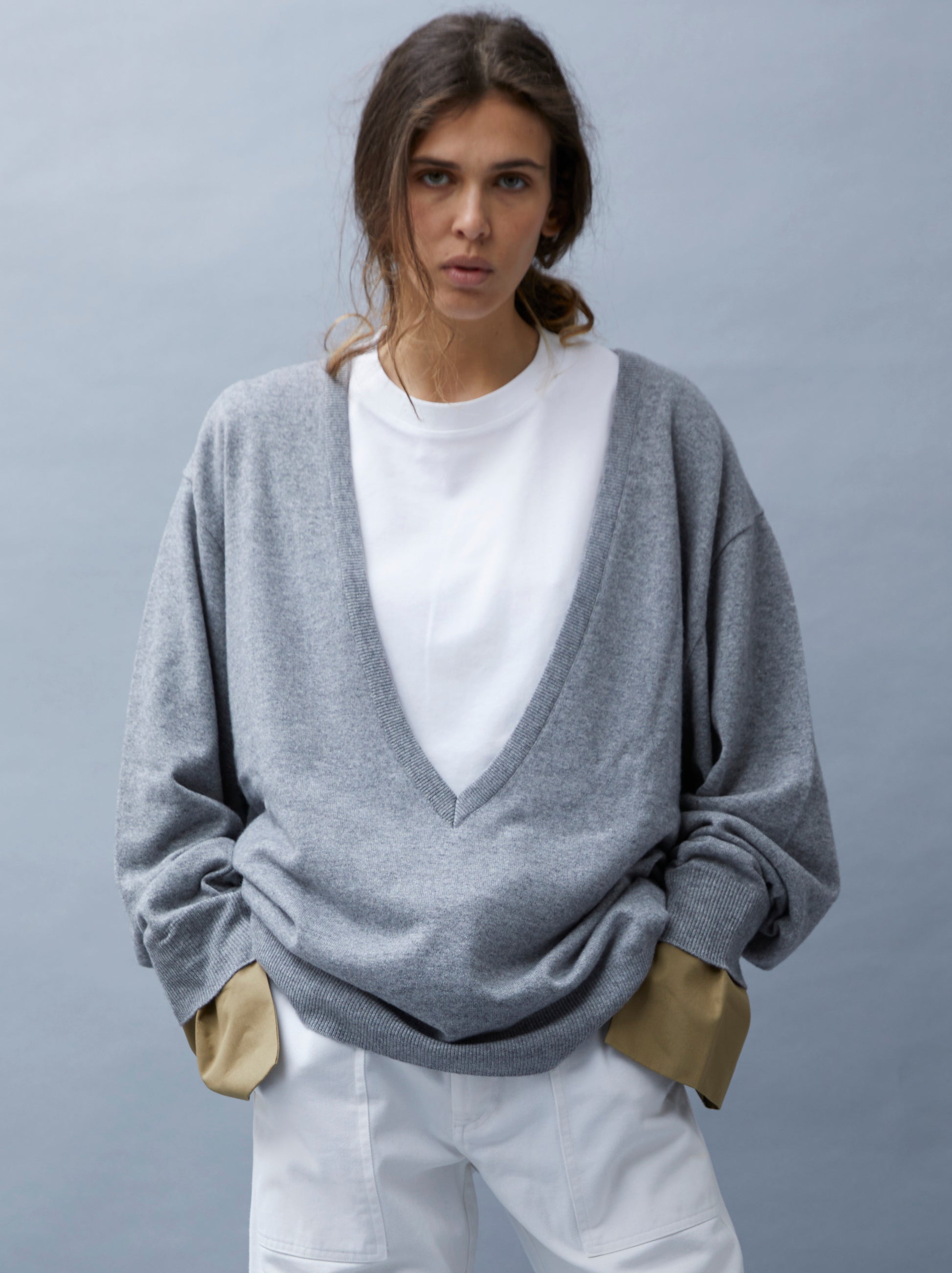 The ANNIE V NECK PULL is an oversized blue sweater with a deep V-neck, offering a relaxed and stylish fit for everyday comfort.