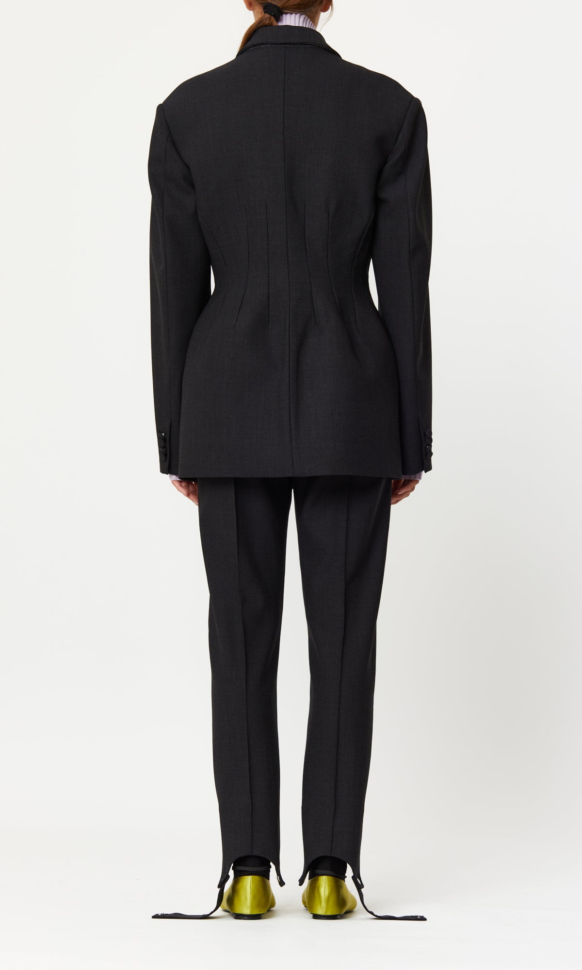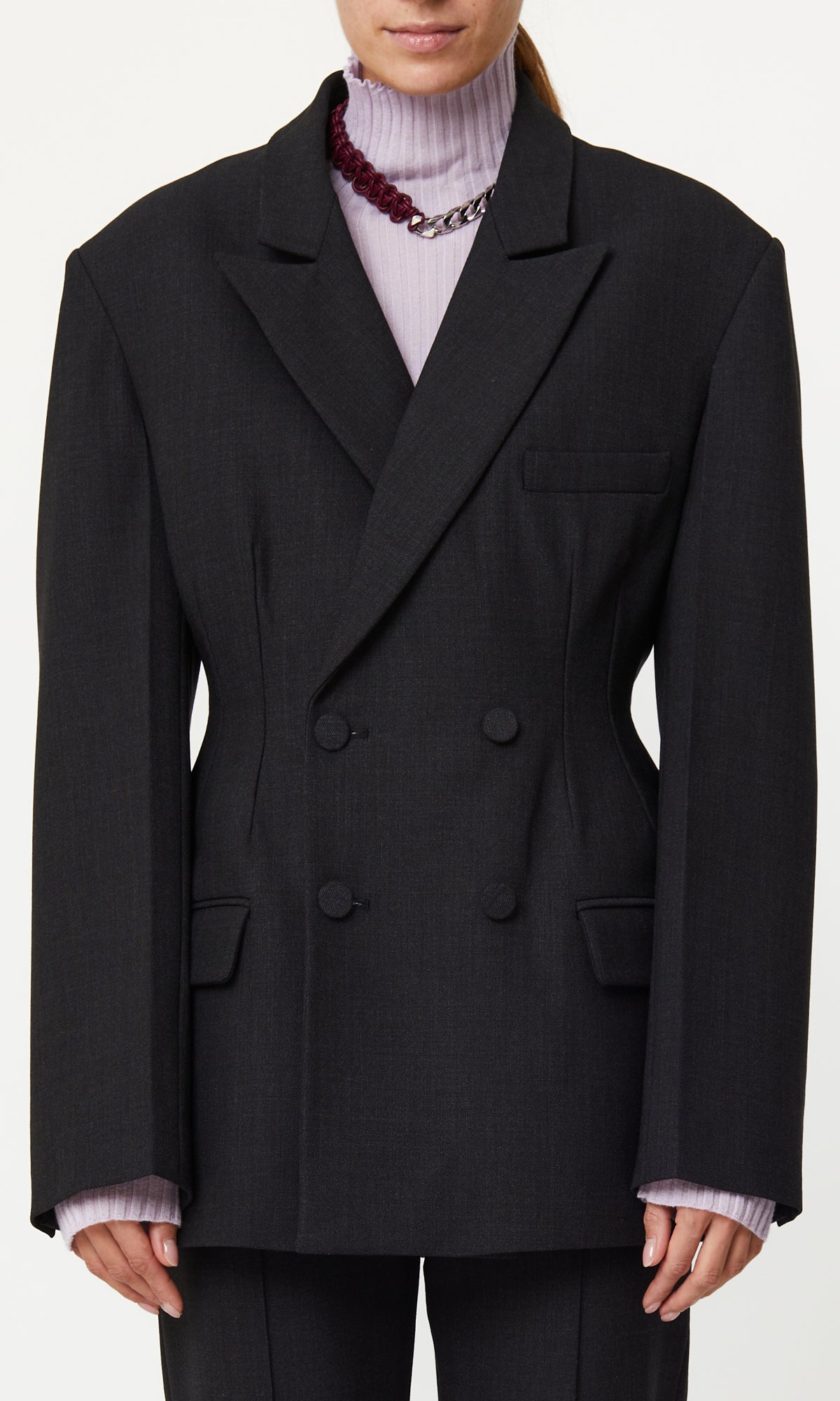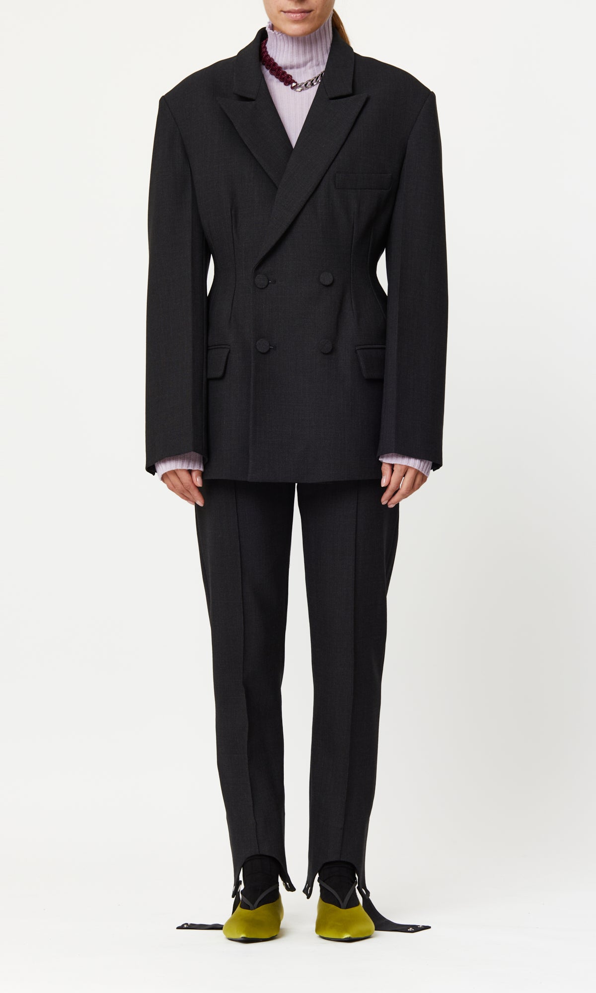 This double-breasted blazer features a sharply tailored fit with broad shoulders, crafted in Italy.