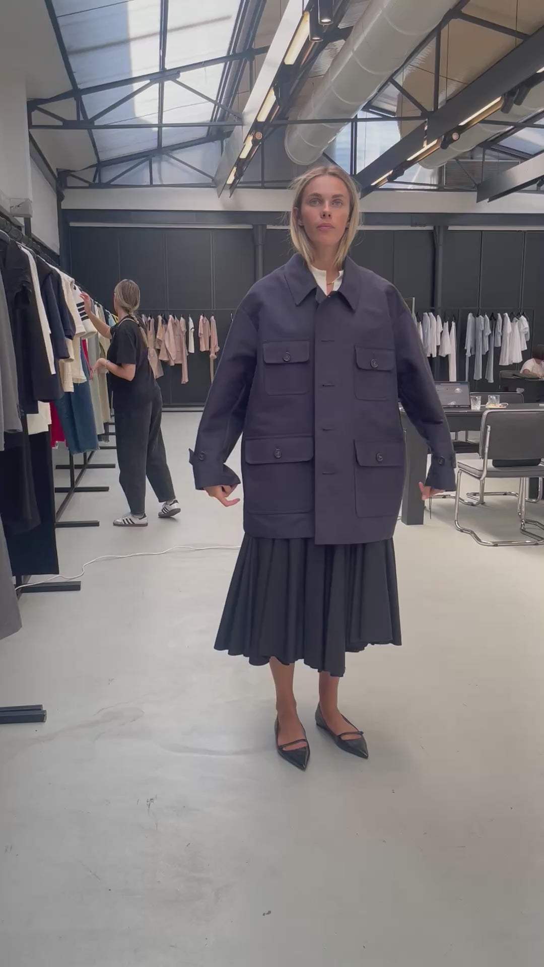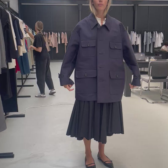 The N21 oversize caban in blu notte features large patch pockets for a relaxed, stylish look. Its roomy fit ensures comfort and modern appeal.