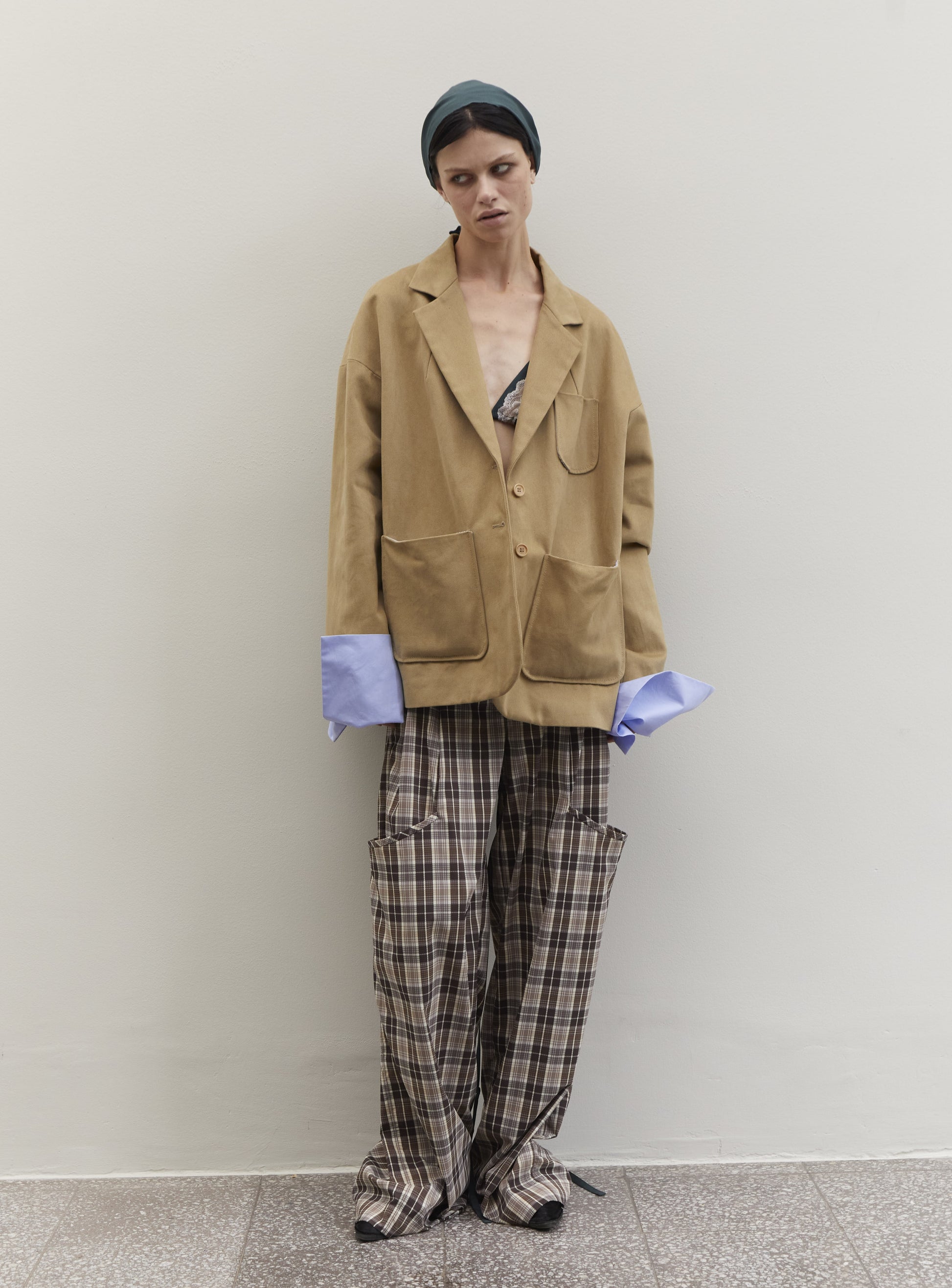 This Maison Jejia blazer, crafted from soft nut cotton, features practical patch pockets for effortless style and functionality.