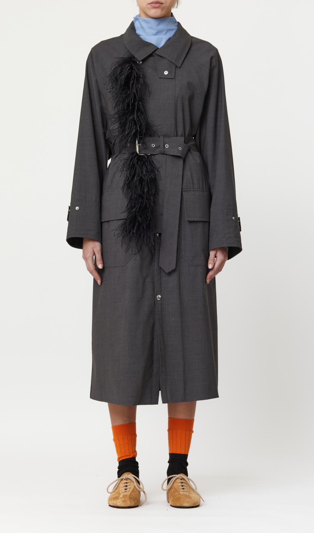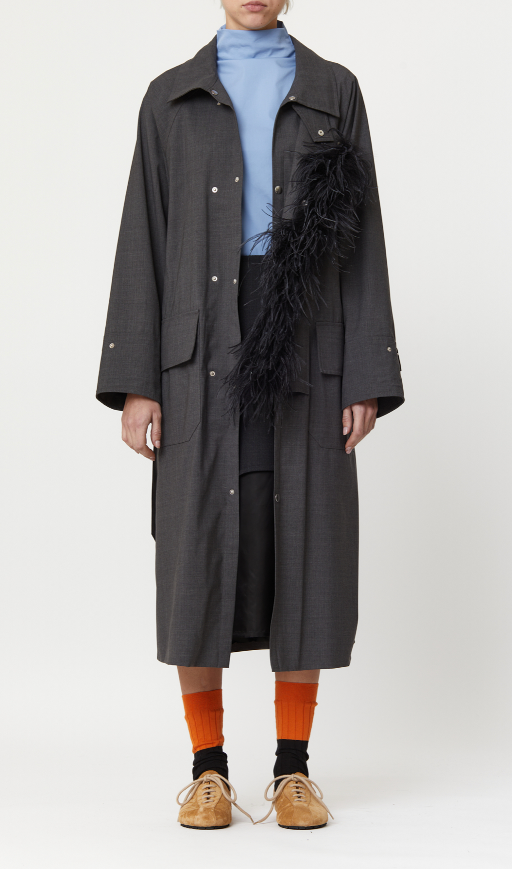 Chic coat featuring a removable grey feather, made in Italy.
