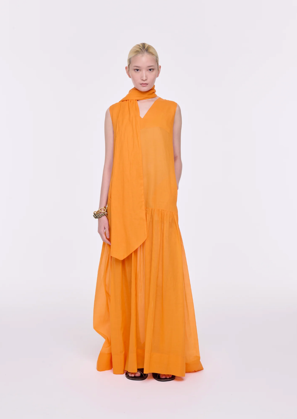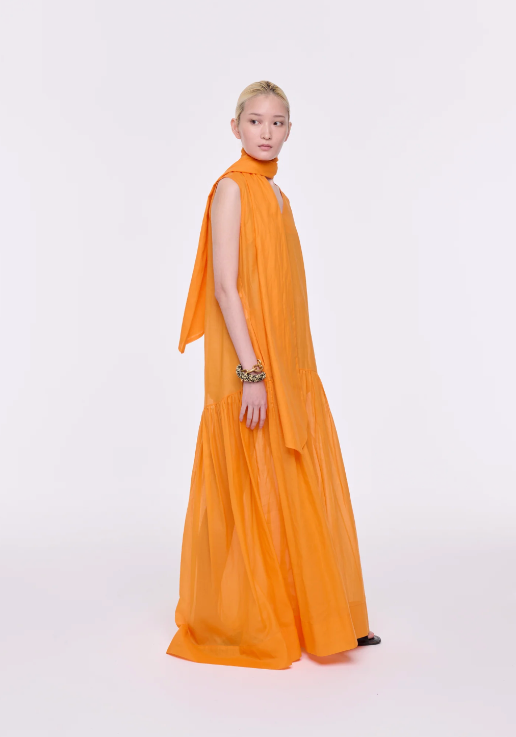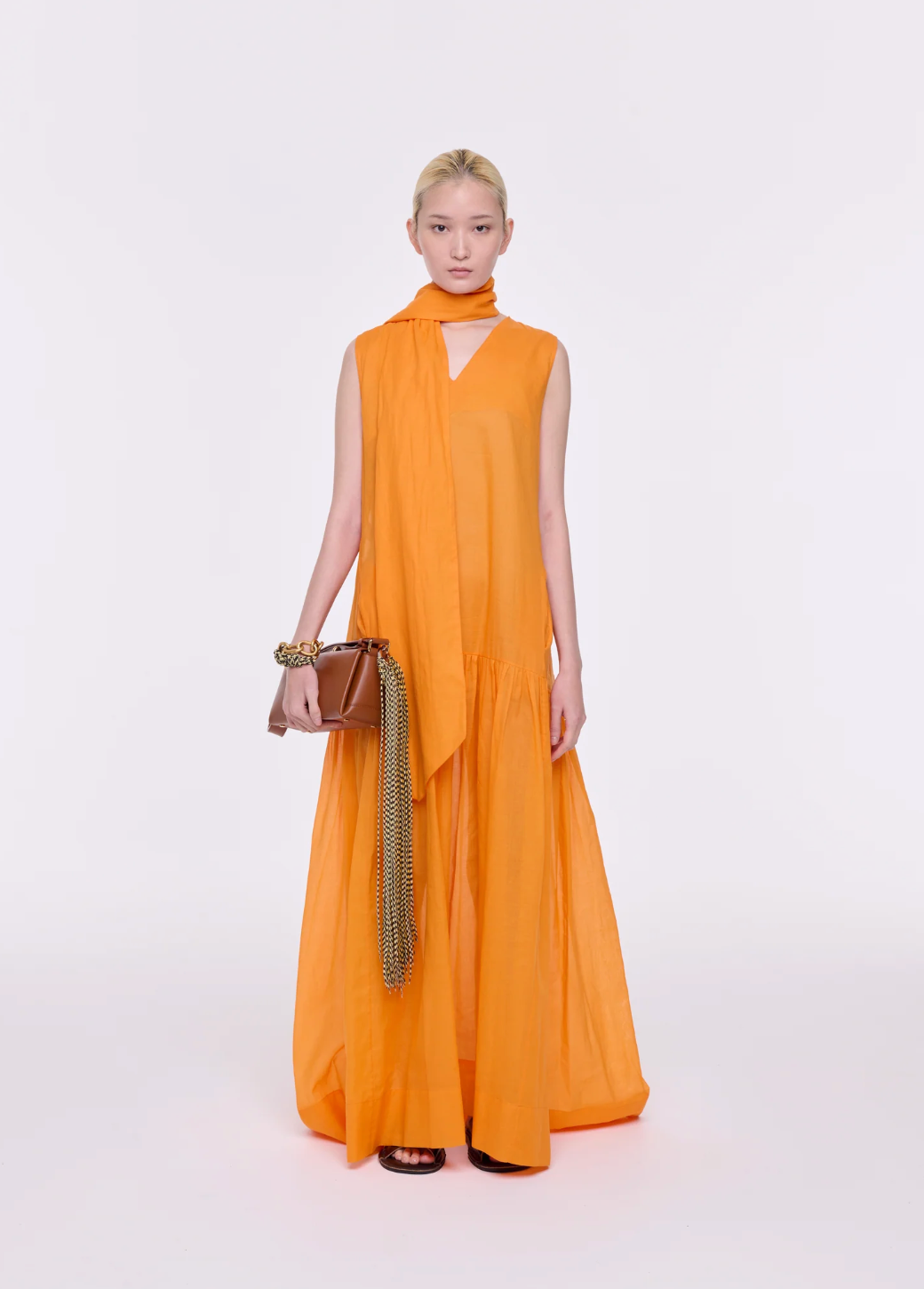 Long dress in cotton organza with detachable self-tie. V-neck. Full length and asymmetric hem. Front concealed pockets. A-line silhouette.