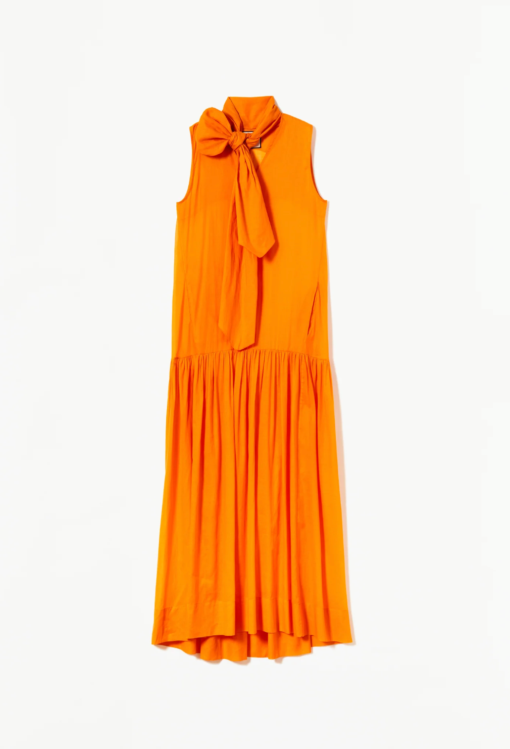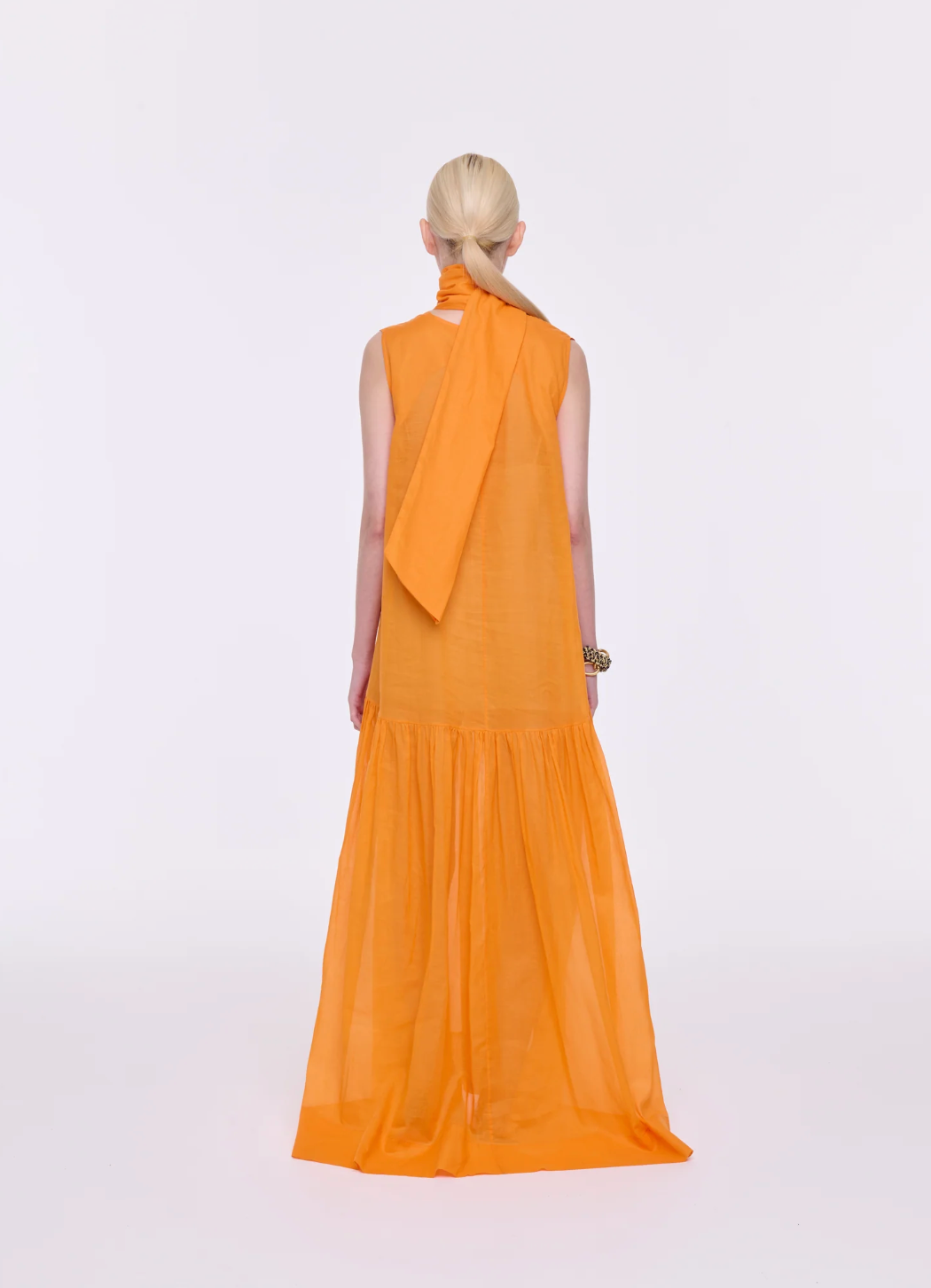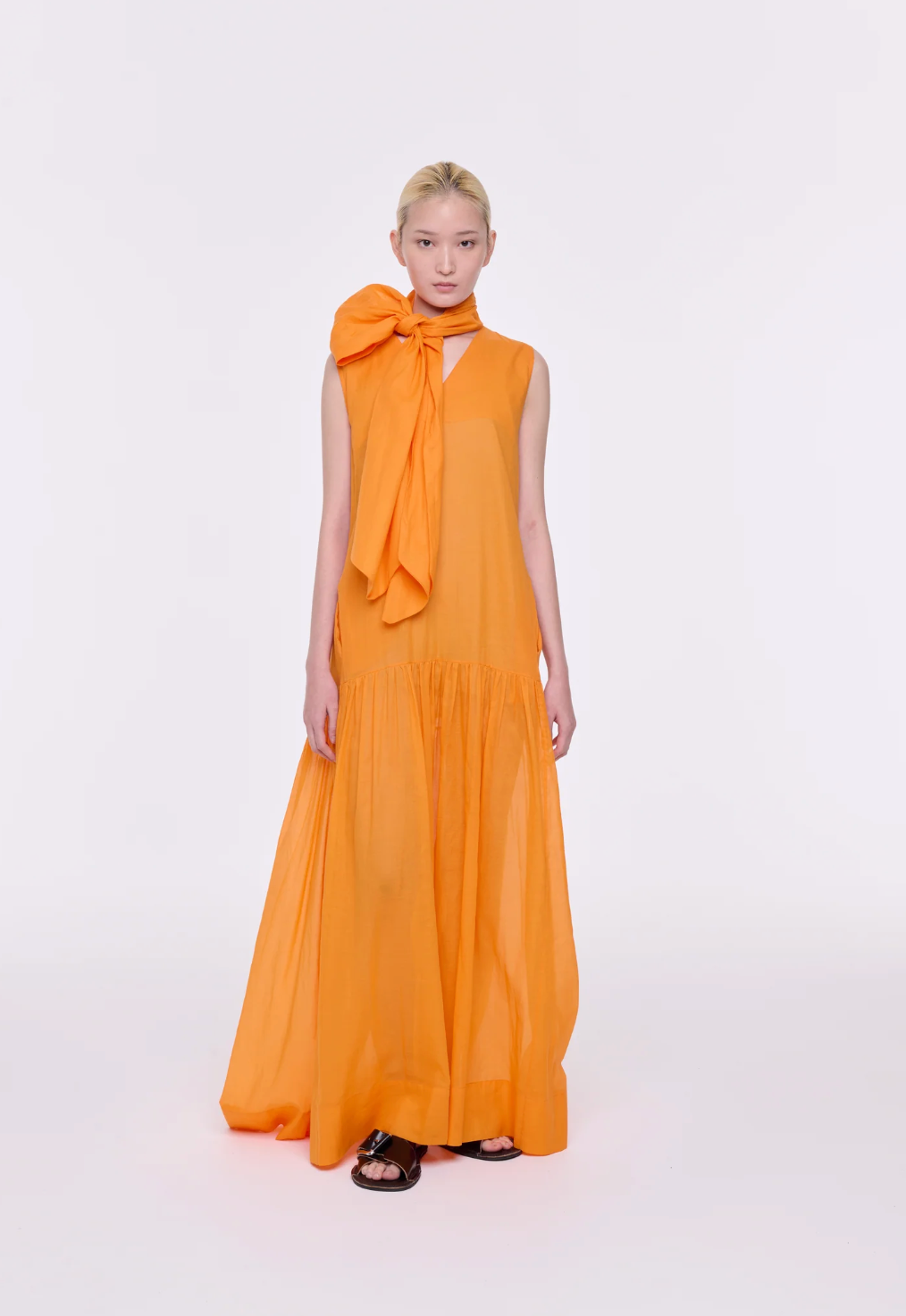 Long dress in cotton organza with detachable self-tie. V-neck. Full length and asymmetric hem. Front concealed pockets. A-line silhouette.