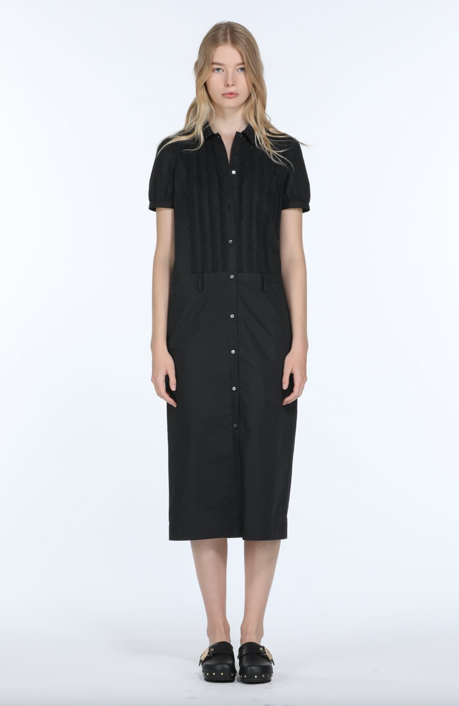 Half sleeved poplin dress, micro ruffles in the front bust, belt loops at the waist