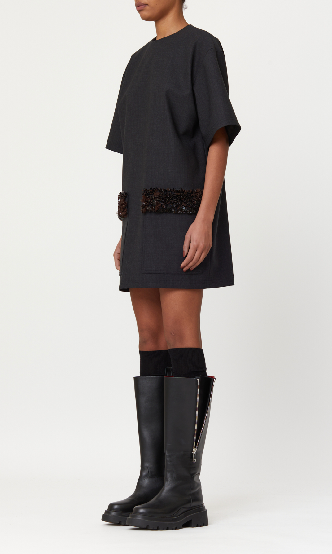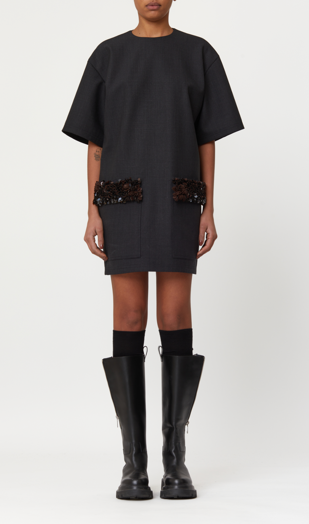 This elegant dress features two pockets and a subtle black sequin detail. Made from 97% virgin wool and 3% elastane, it offers comfort and a perfect fit. Crafted in Italy with quality materials.