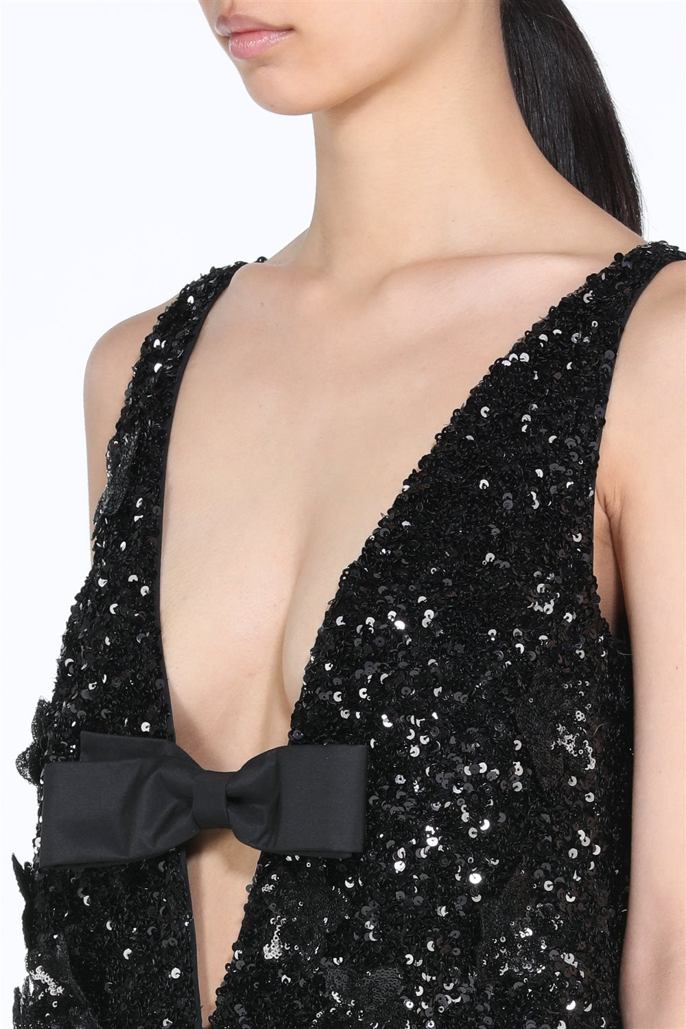 Black sequin dress with an oversized satin bow embellishment at the front. Plunging V-neck. Sleeveless. Mini-length A-line silhouette. 2 side pockets, sequin flower appliqué details.