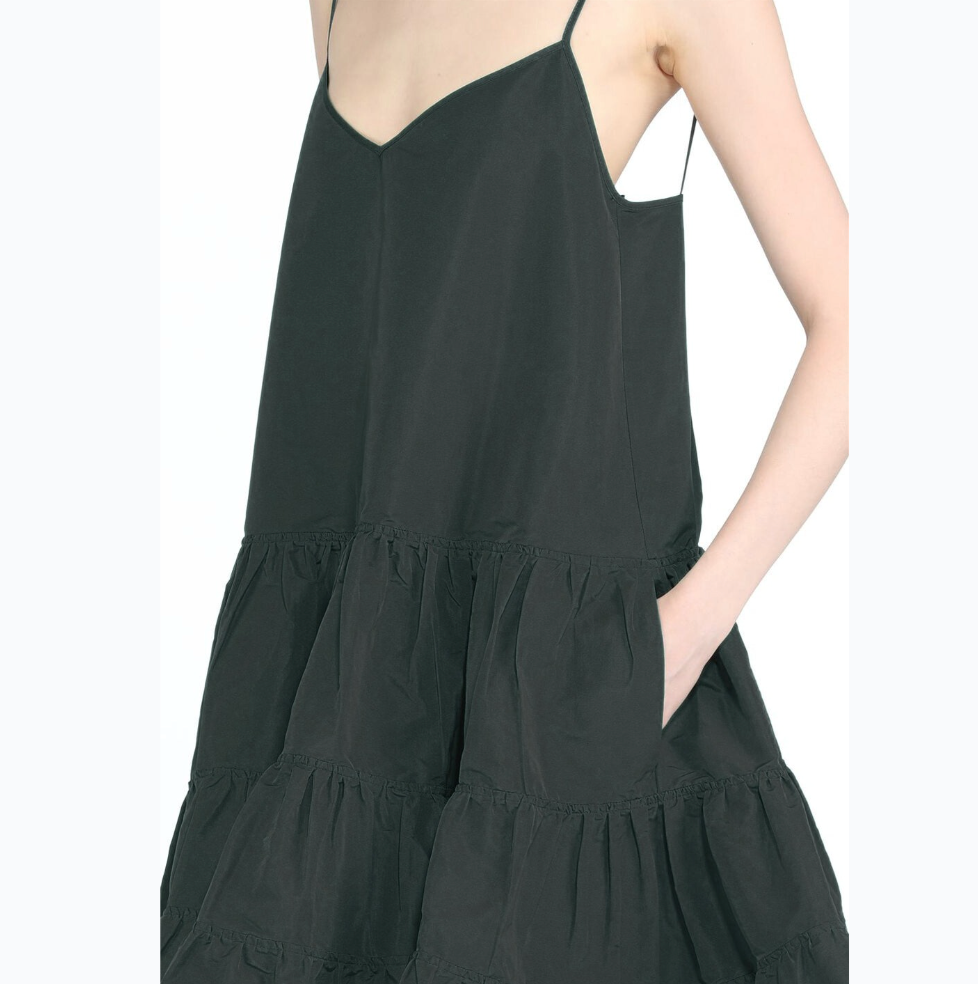 Black midi-length slip dress with ruffles, wide and relaxed fit.