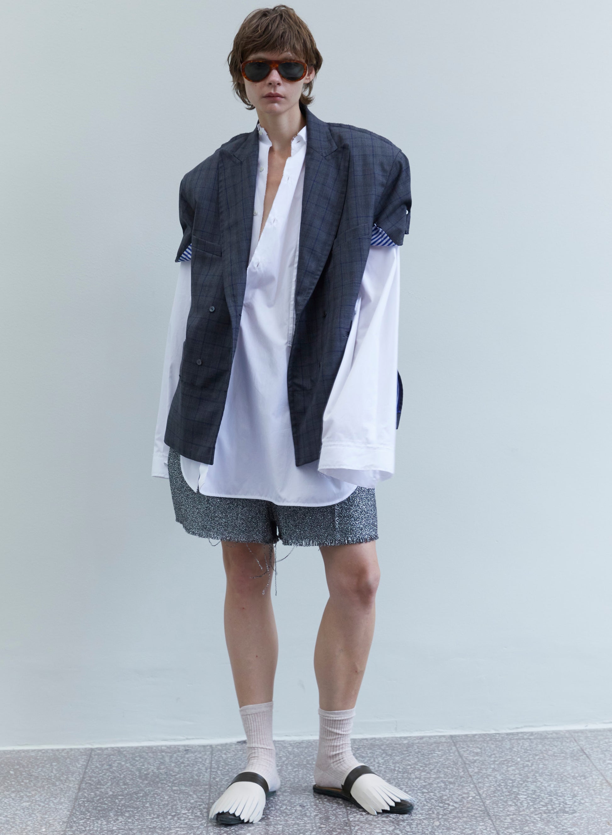 Short-sleeved double-breasted Maison Jejia blazer in grey check. Sophisticated tailoring for effortless layering and refined everyday wear.