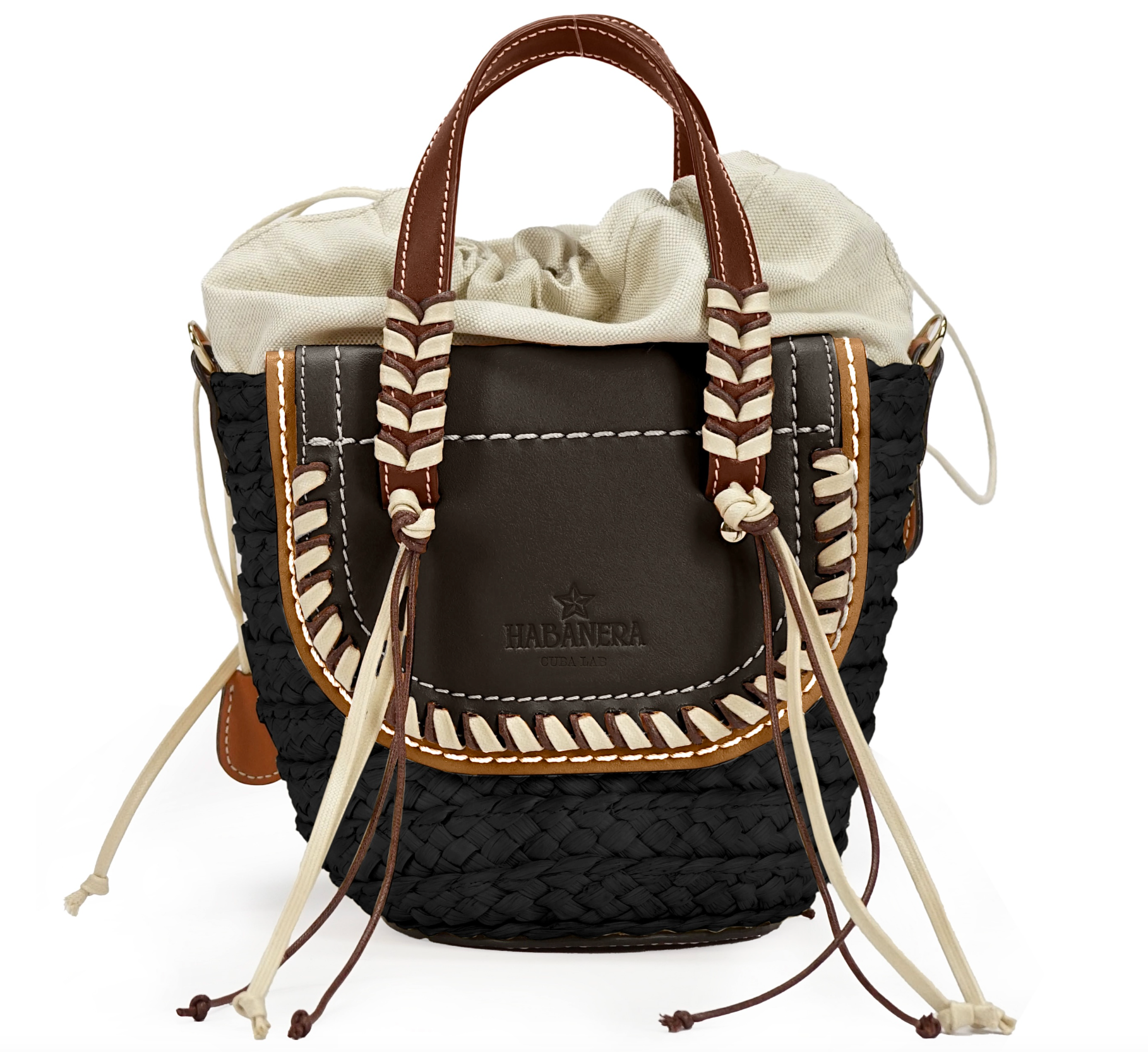 The Habanera bag has two leather handles and the possibility of being brought too crossbody. In this style the two kenia leather flaps and ebony handles are decorated with all around thick stitched edge and with a cord double threading in dark brown and ecru color, entirely handmade. The lining is made with a beige linen up-cycled fabric.