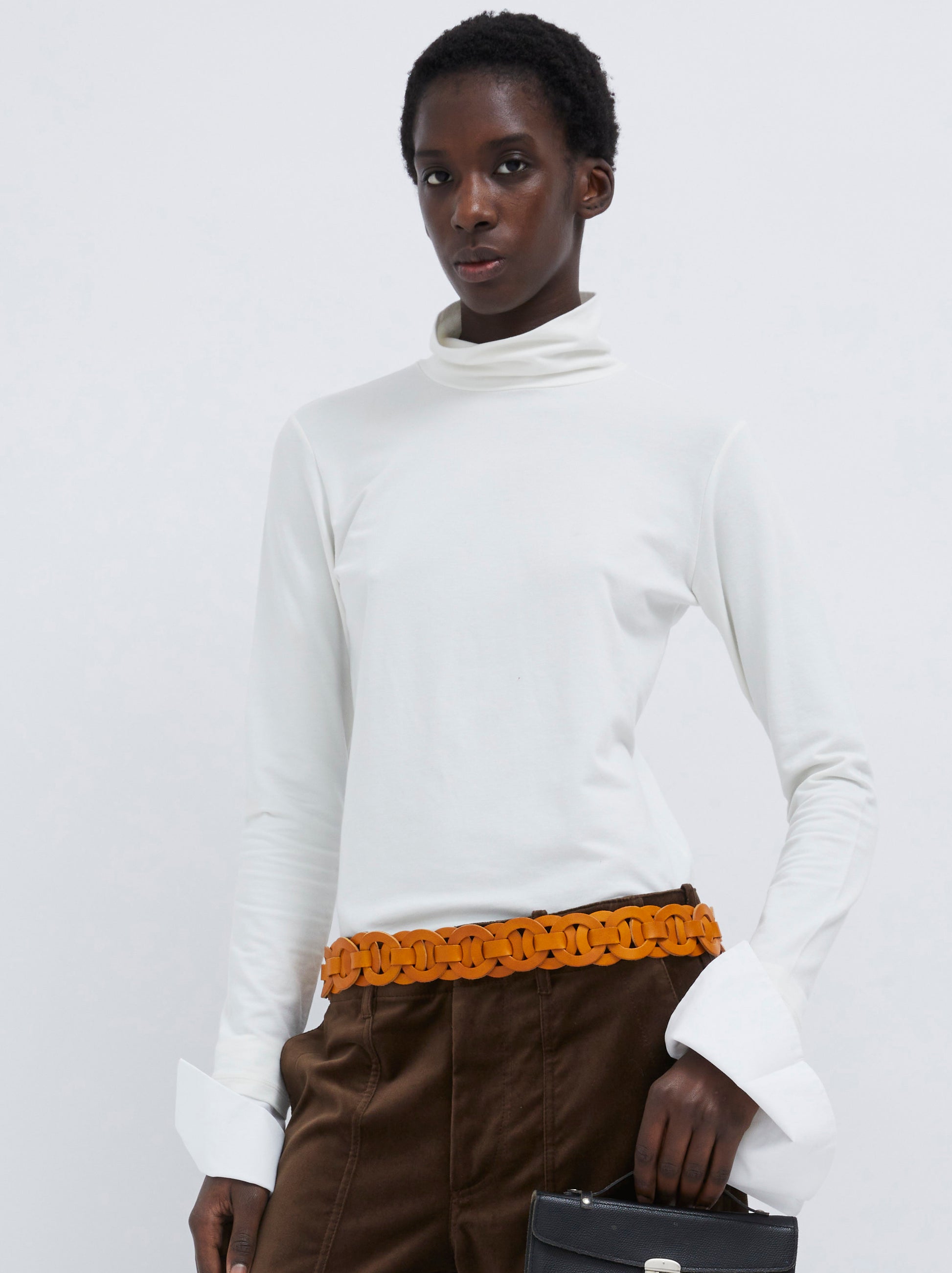 This white long-sleeve jersey top features a stylish turtleneck and classic shirt cuffs, combining comfort with a refined look. Perfect for layering or wearing on its own for a sleek, modern outfit.