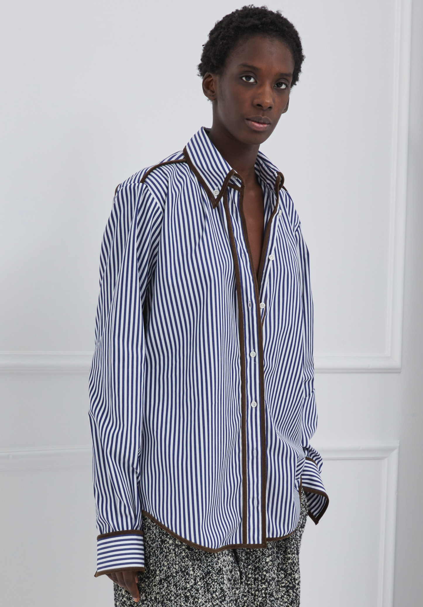 This shirt features playful stripes with a soft velvet trim for a fun and stylish look.