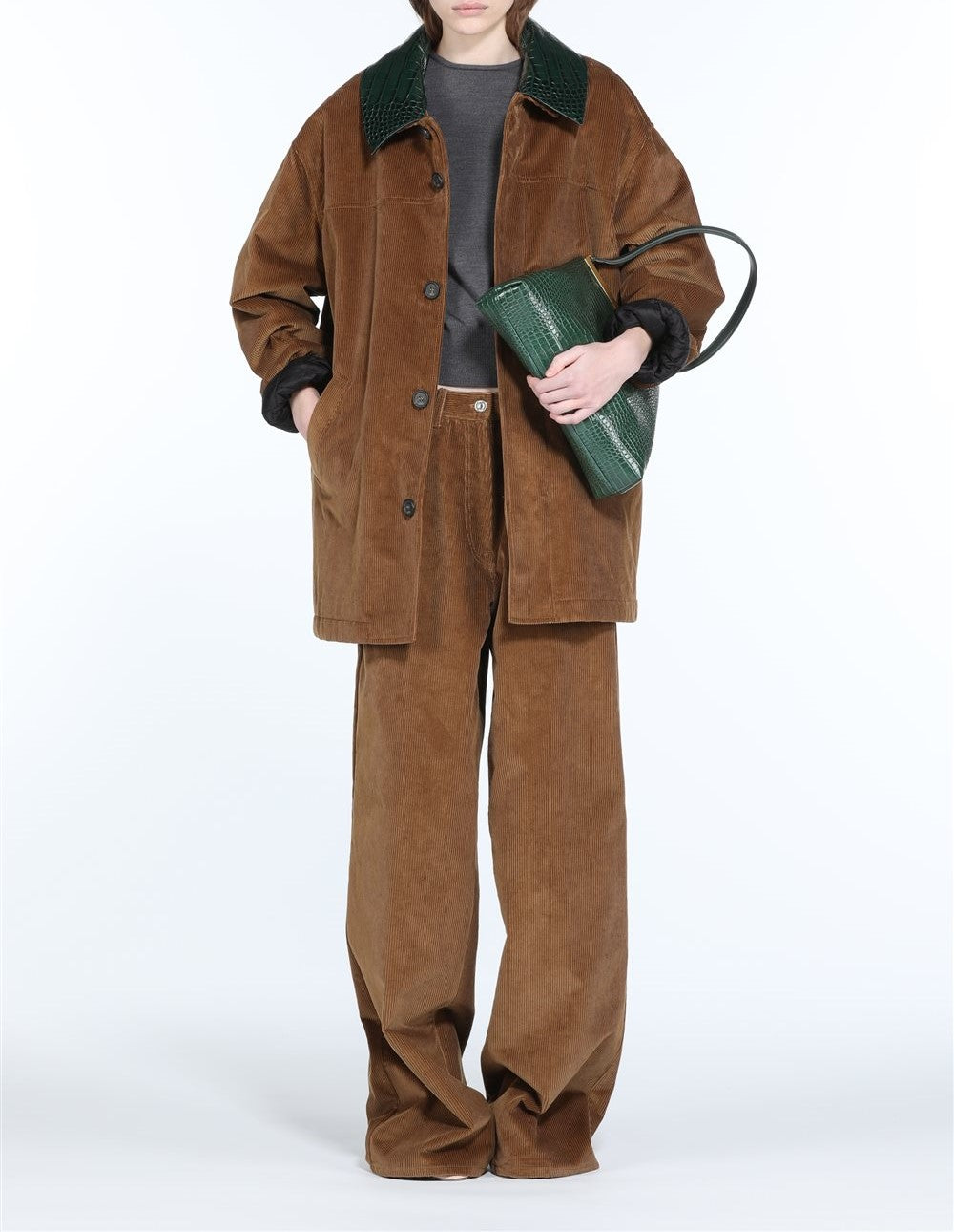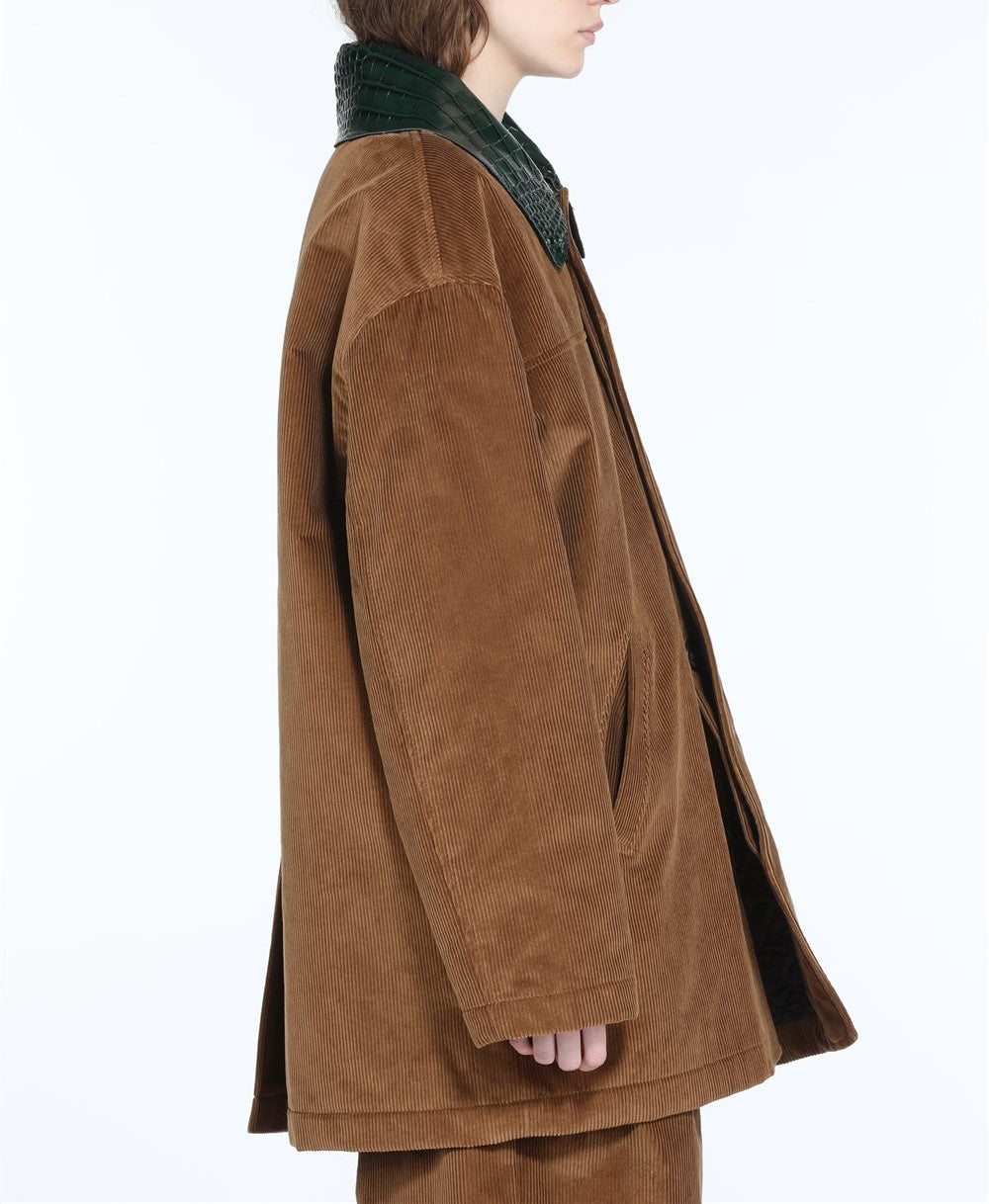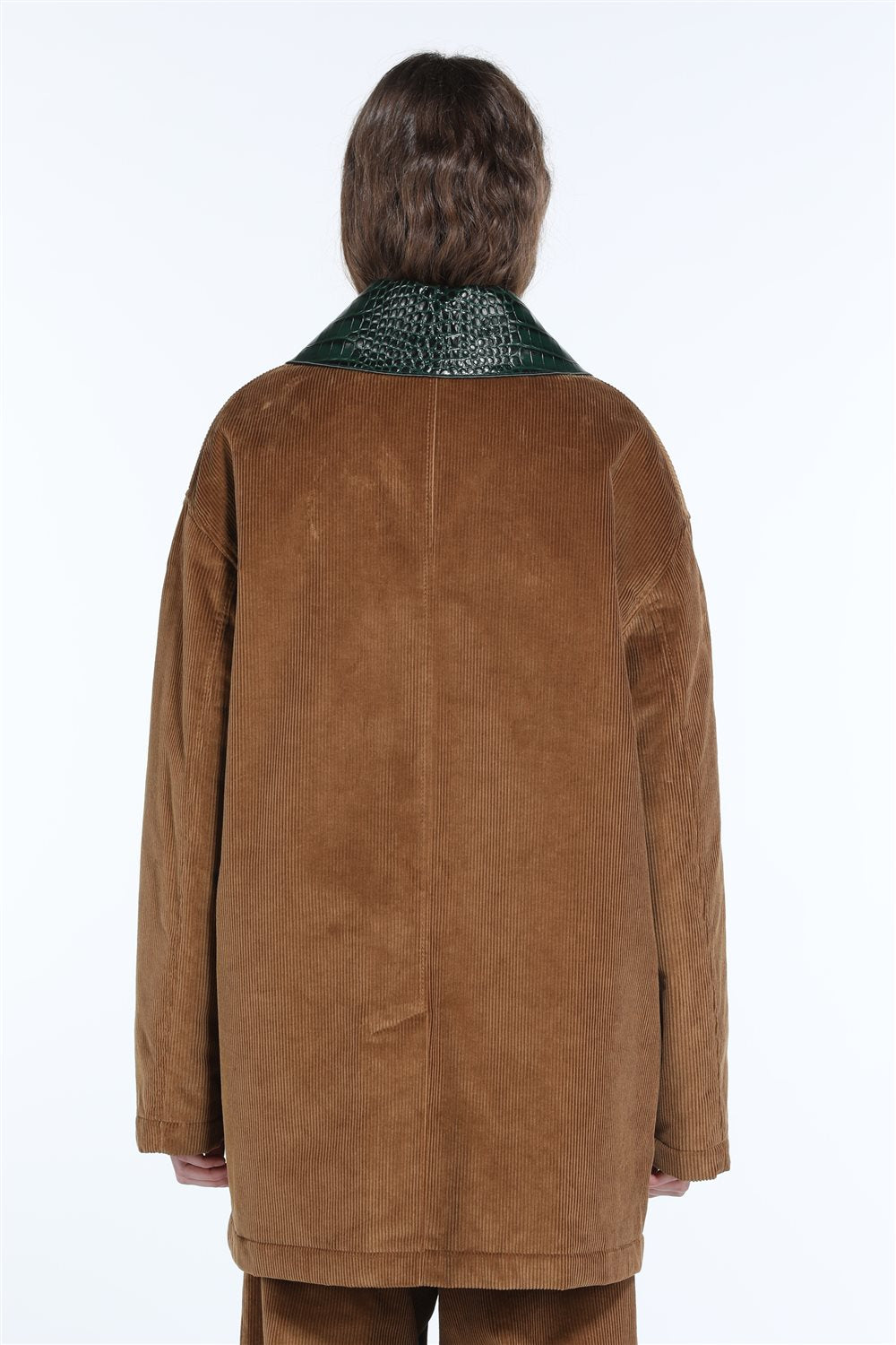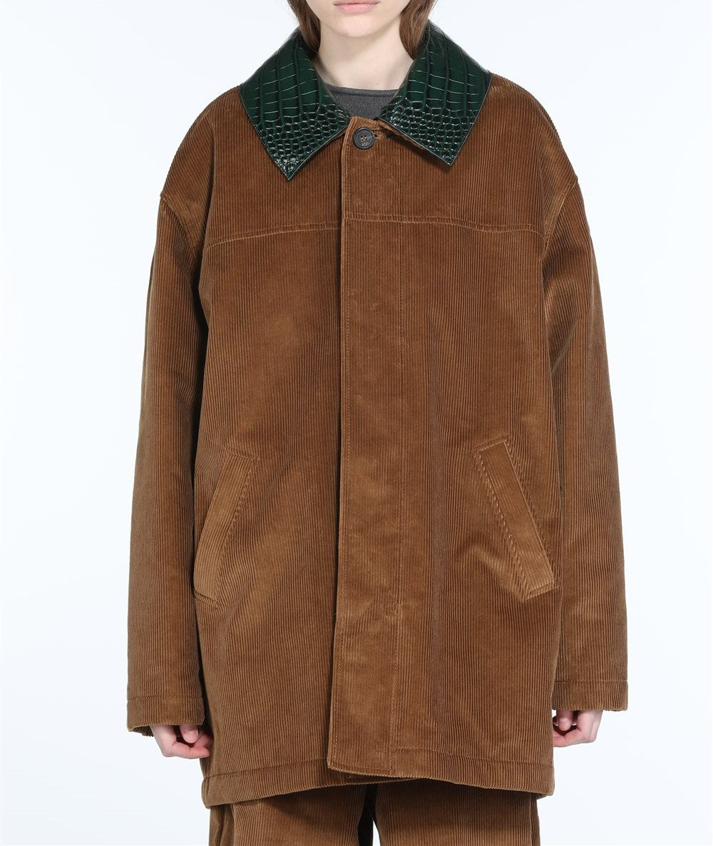 This oversized sporty jacket comes in a hazelnut cord shade and features a green collar. Crafted in Italy, it includes two pockets for added functionality.