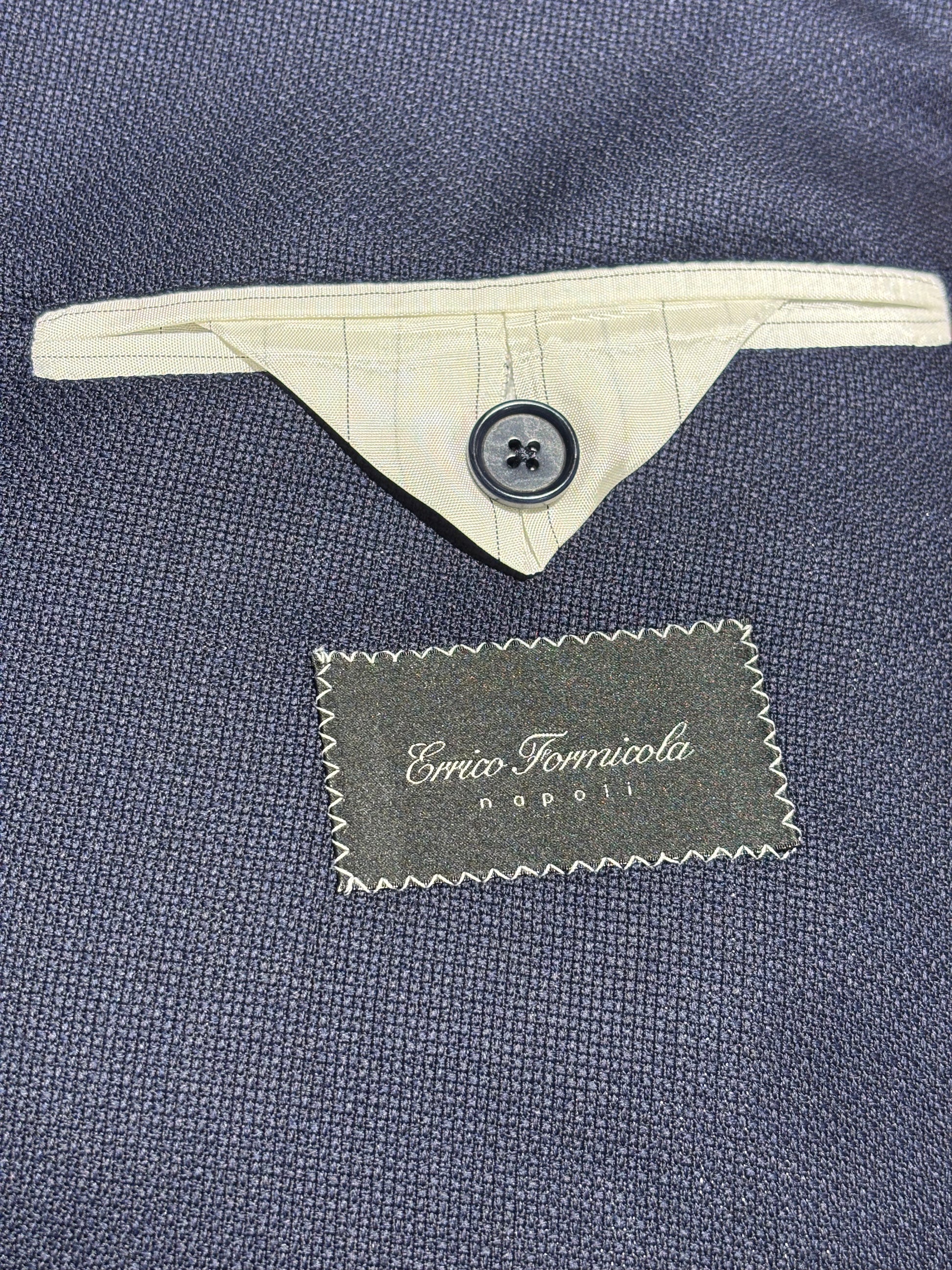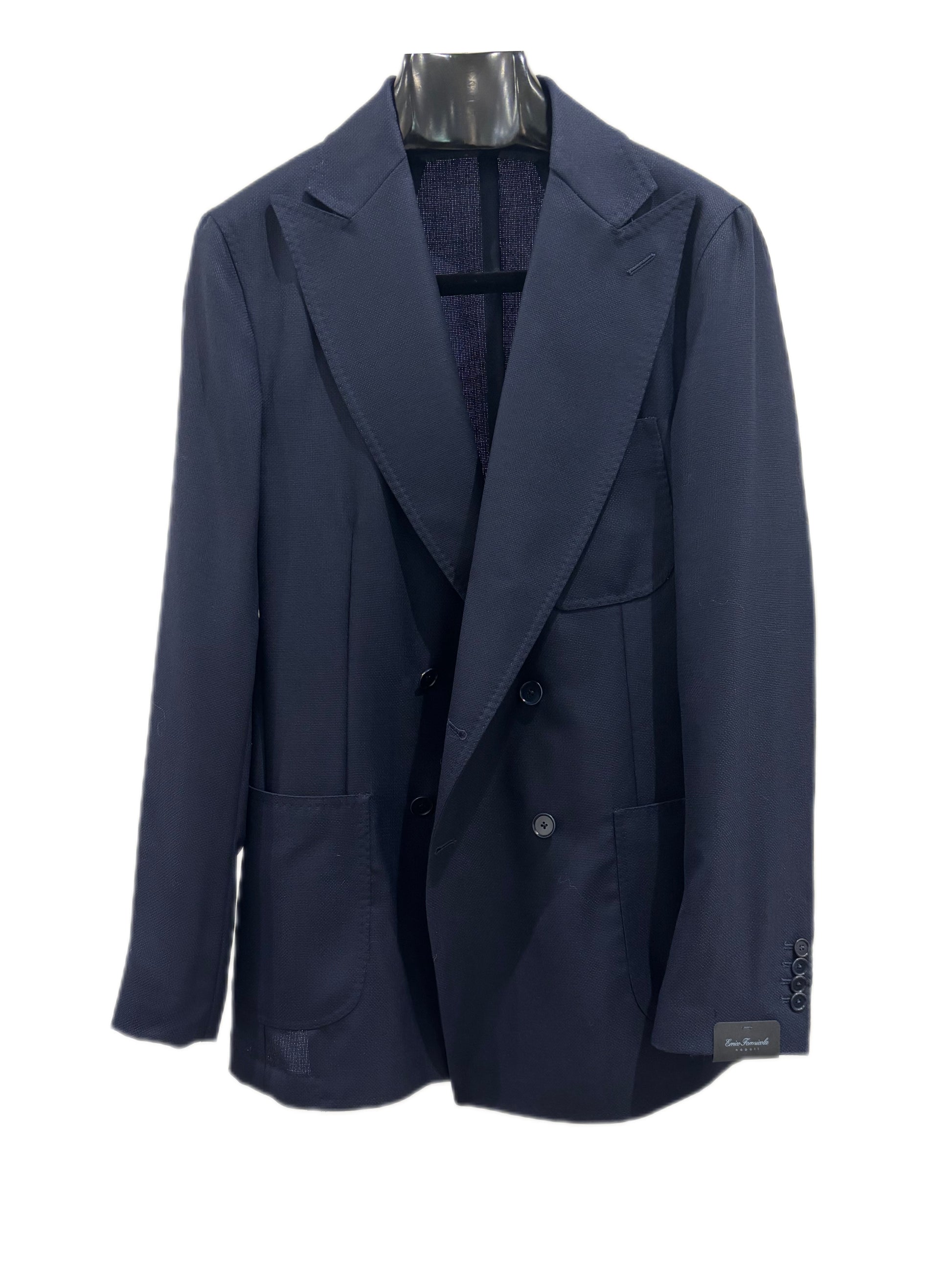 Double-breasted blazer in navy with patch pockets, two vents, open buttonholes on the sleeves, double-stitched.
