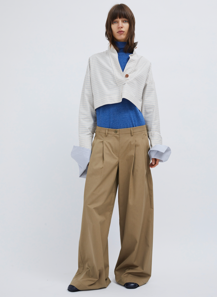 The Katherine Pant features a relaxed fit with wide legs and front pleats, crafted from soft beige cotton for all-day comfort and effortless style.