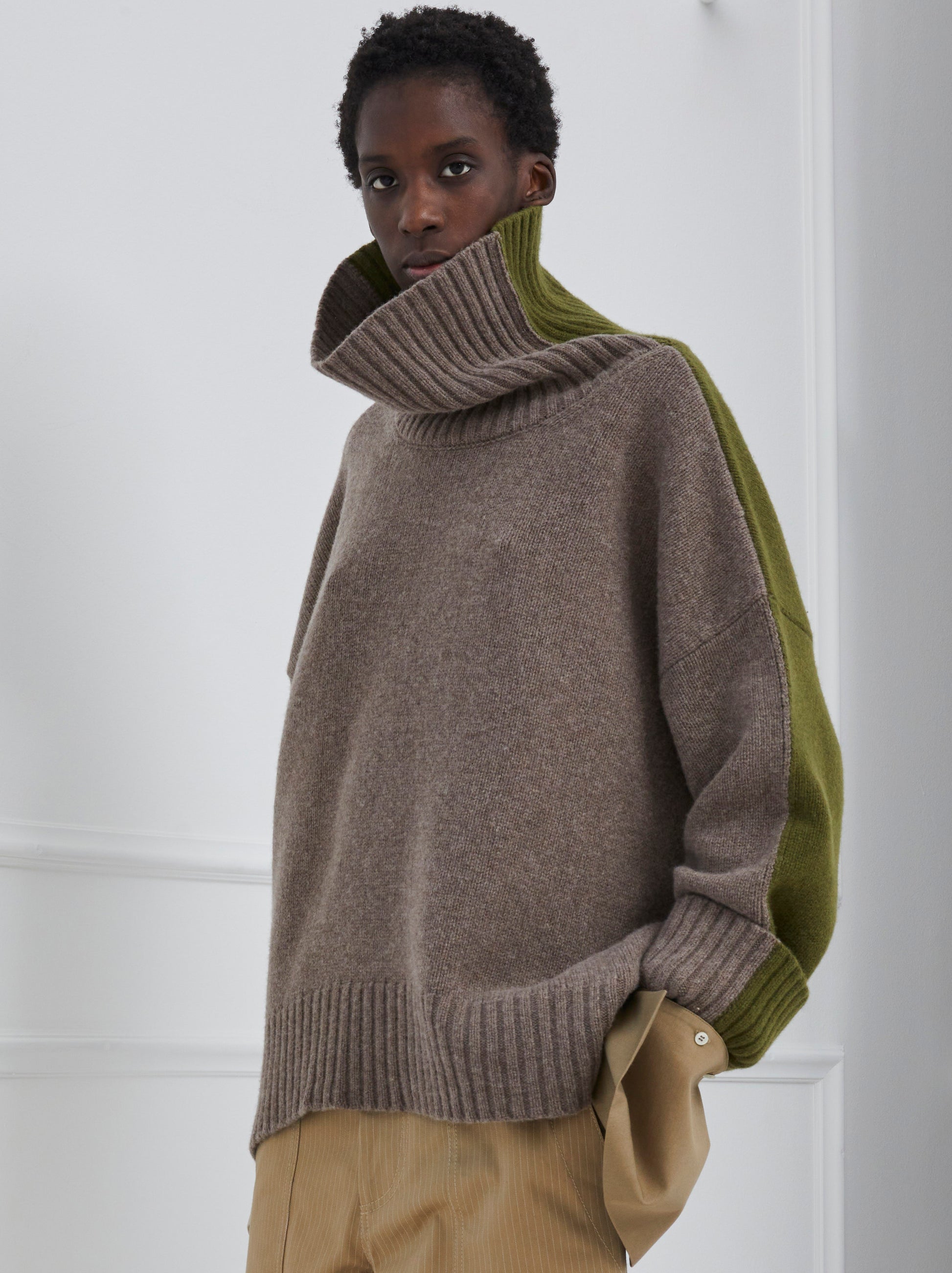 The OLLY OVER TURTLE is an oversized sweater made from soft chocolate and olive wool, offering warmth and relaxed style for cooler days.