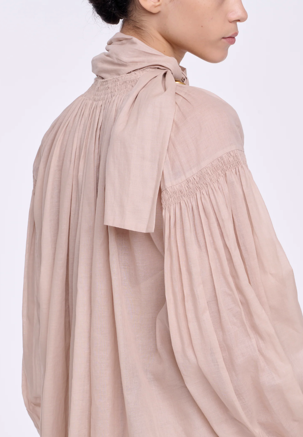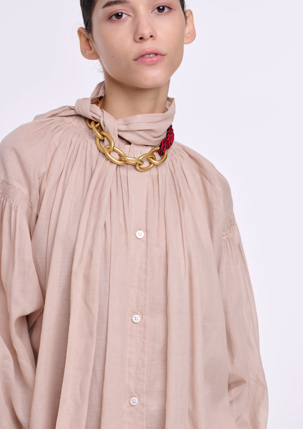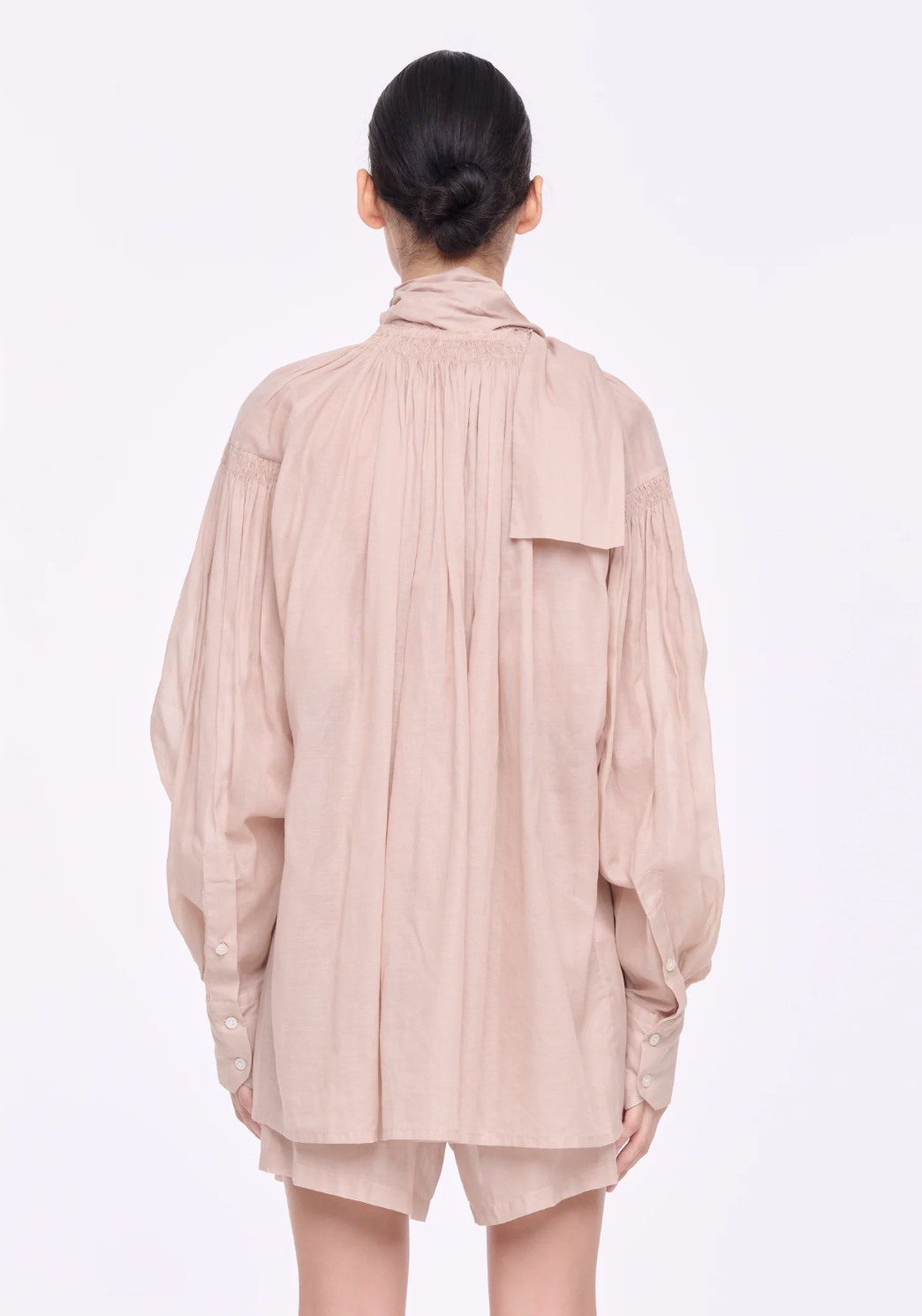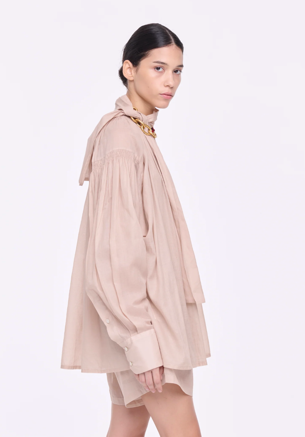 Cotton organza shirt with removable scarf. Round neck with smock stitch details, front button closure. Long sleeves and button cuffs. Elongated split hem. Mid lenght and loose fit.
