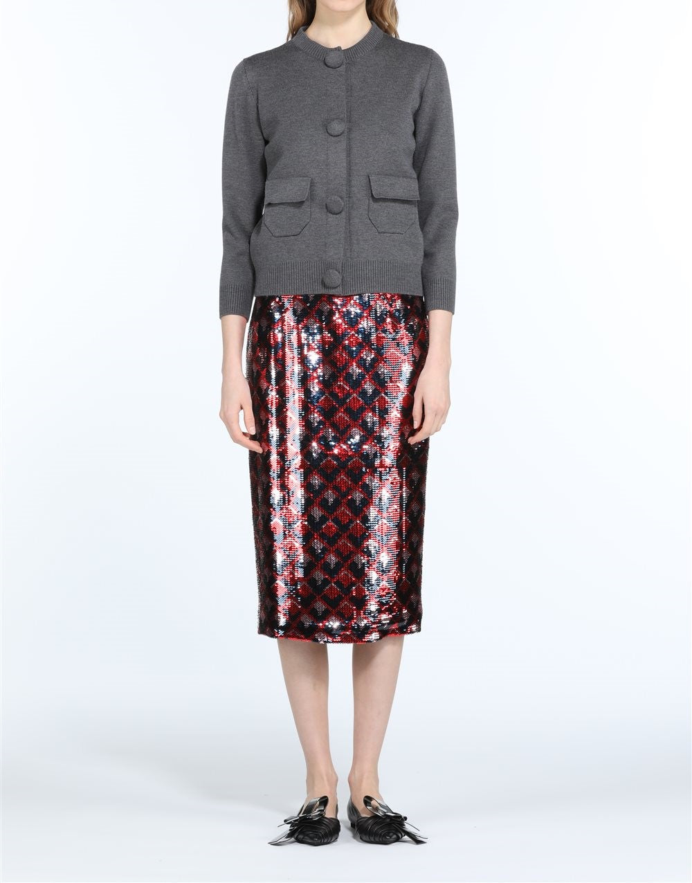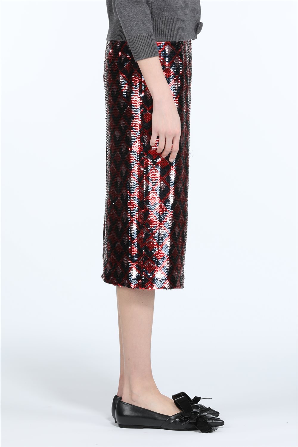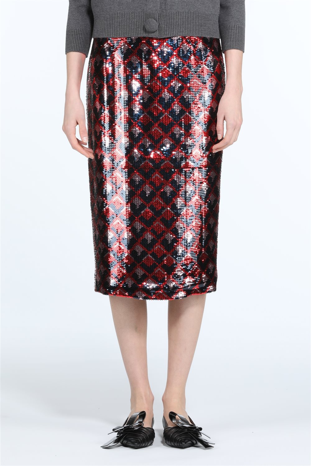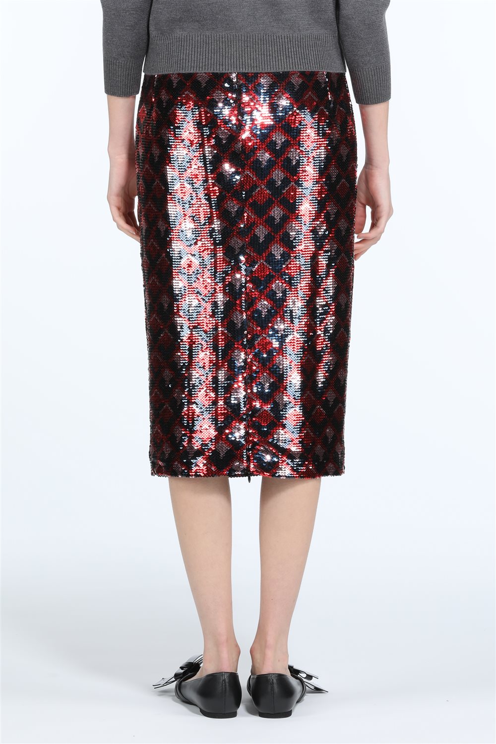 The N21 red lurex skirt features a bold geometric print and a sleek straight cut that falls below the knee. Made in Italy, it offers a stylish and elegant look.
