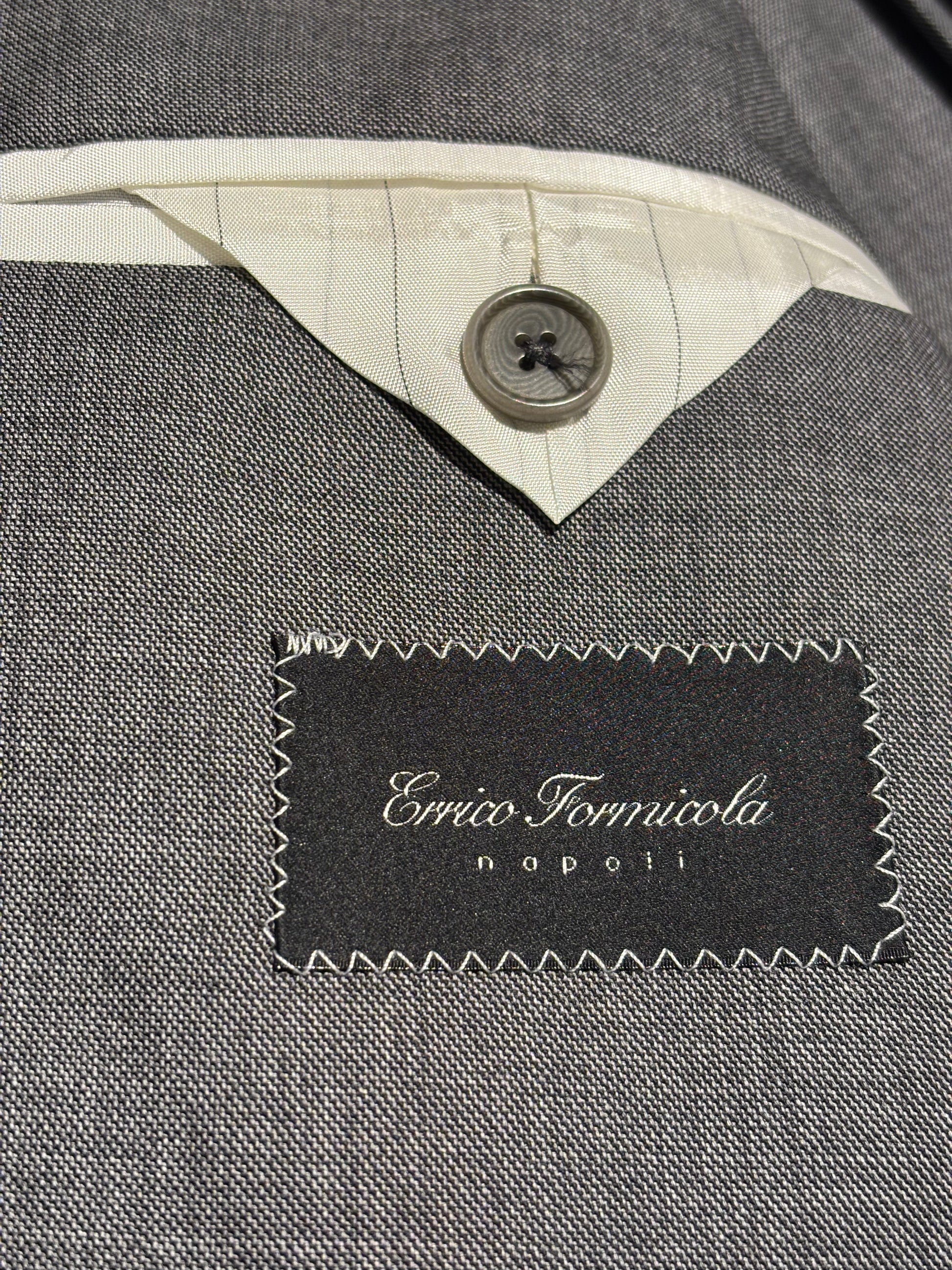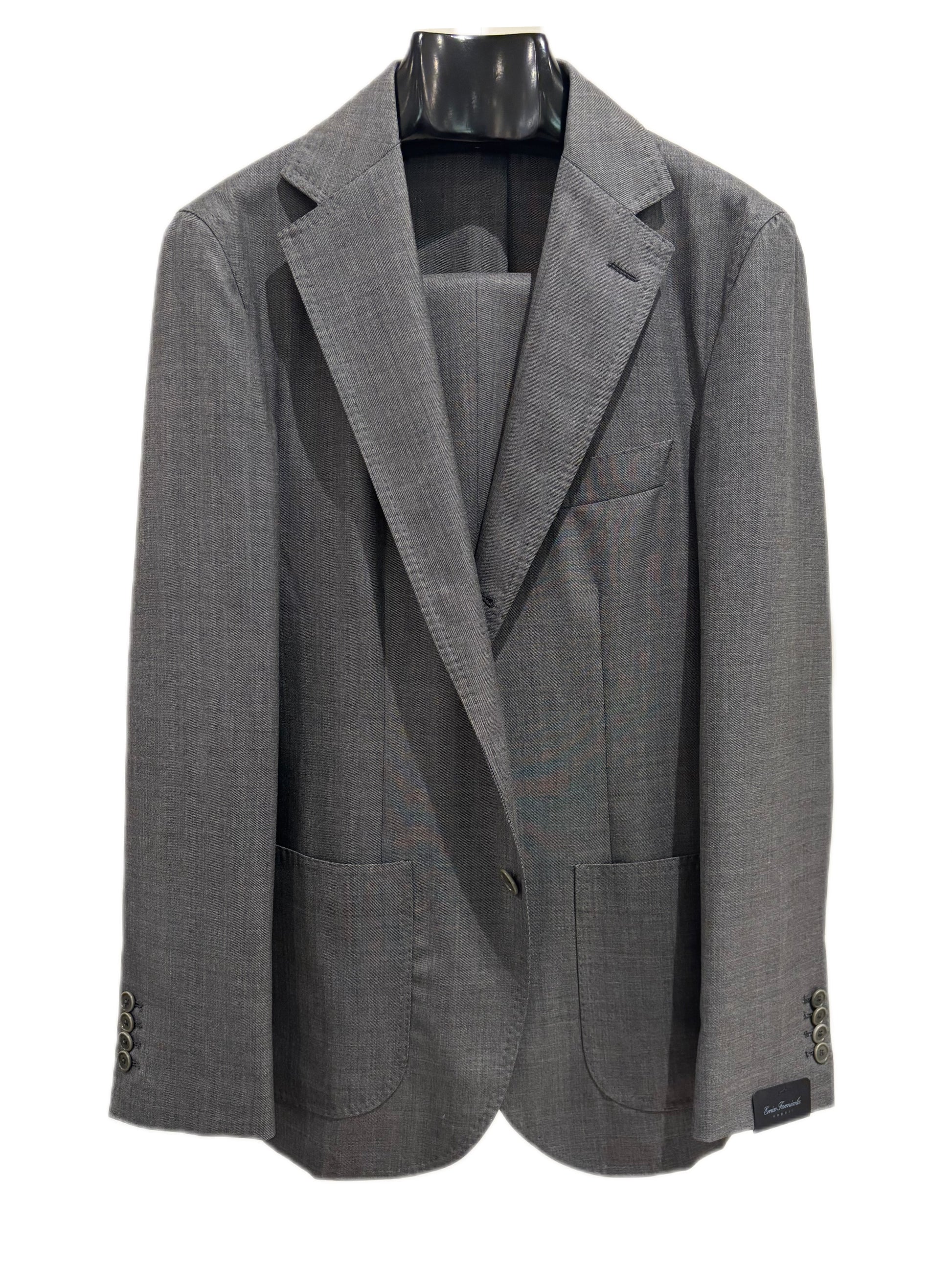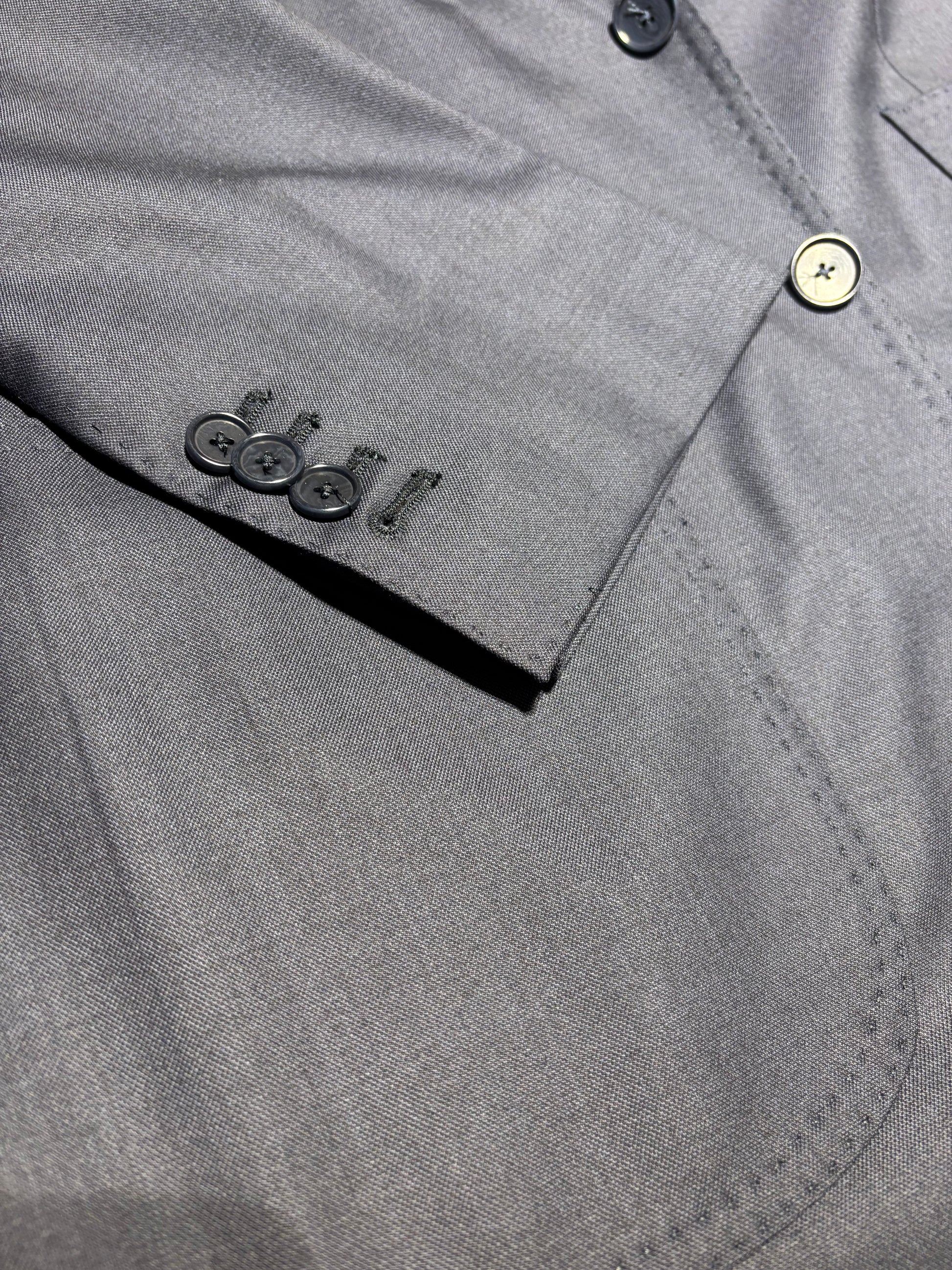 Lightweight medium grey suit with patch pockets, two vents, open buttonholes on the sleeves, double-stitched.