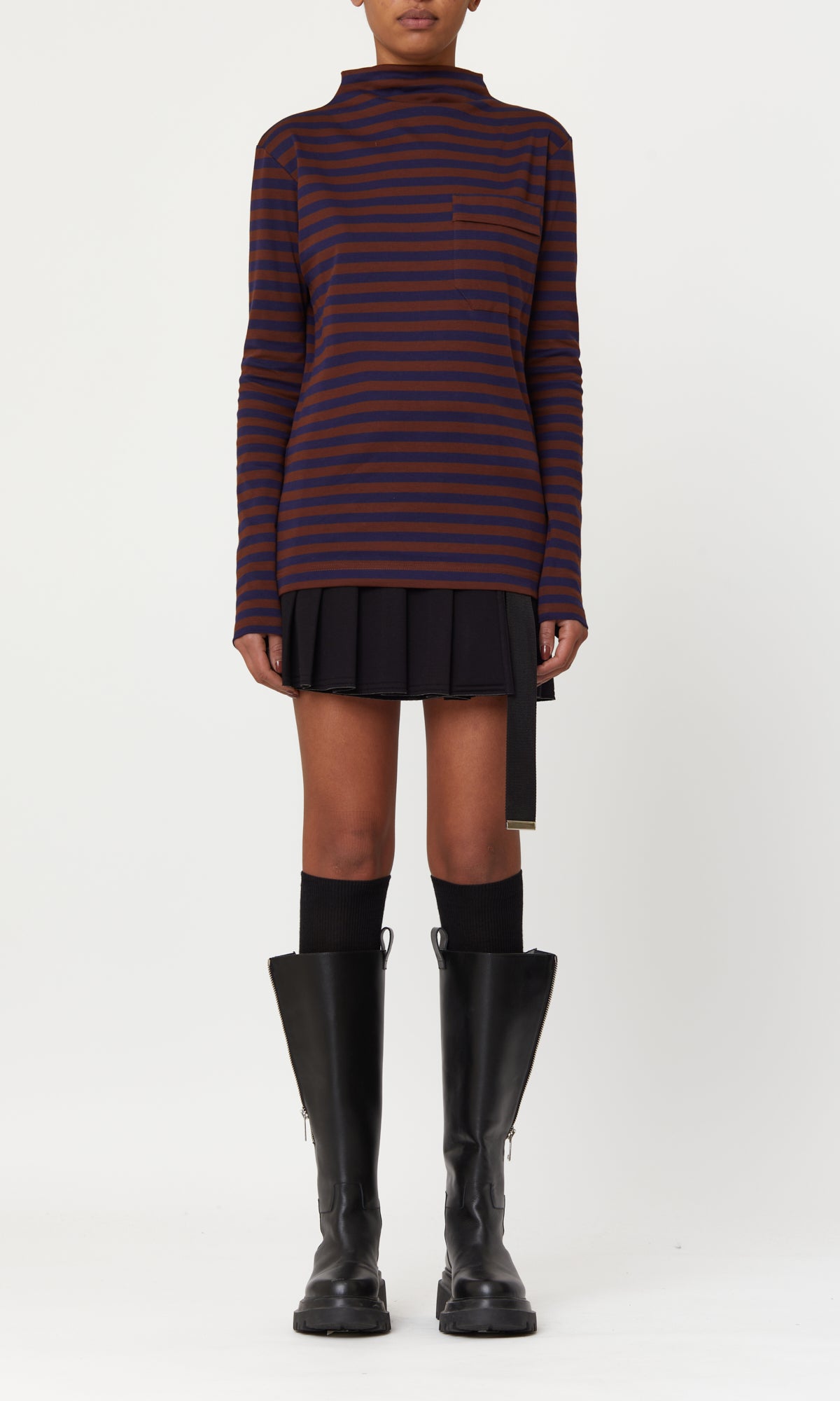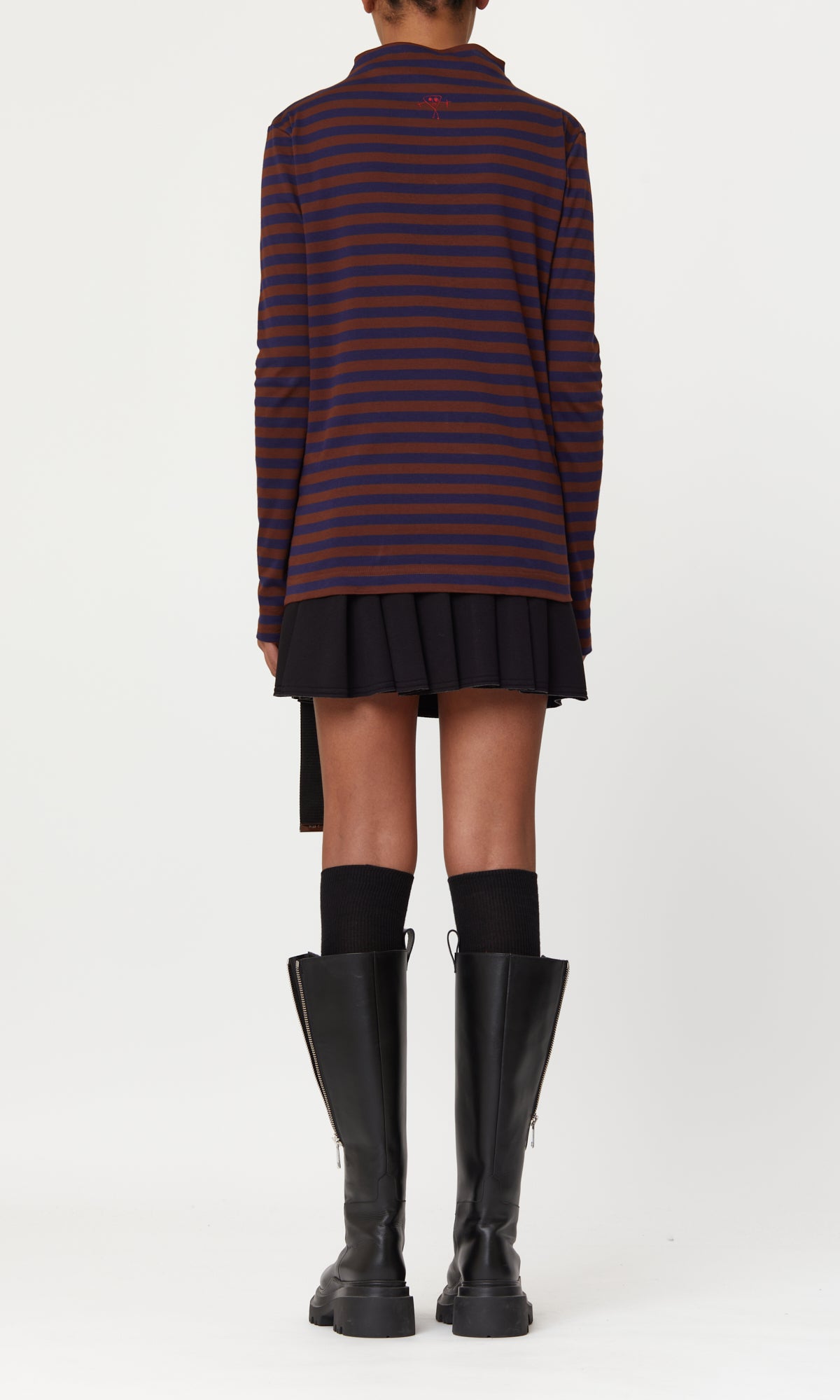 This playful long-sleeve top, striped with brown and blue, is proudly made in Italy.