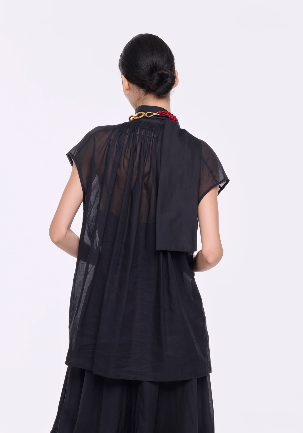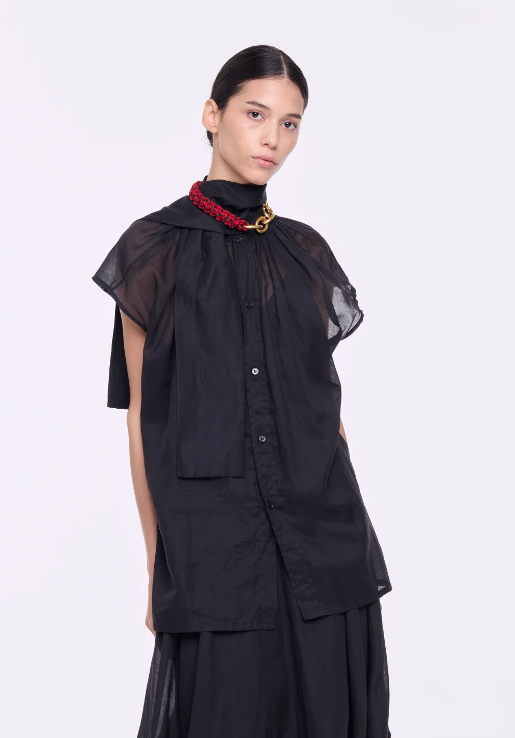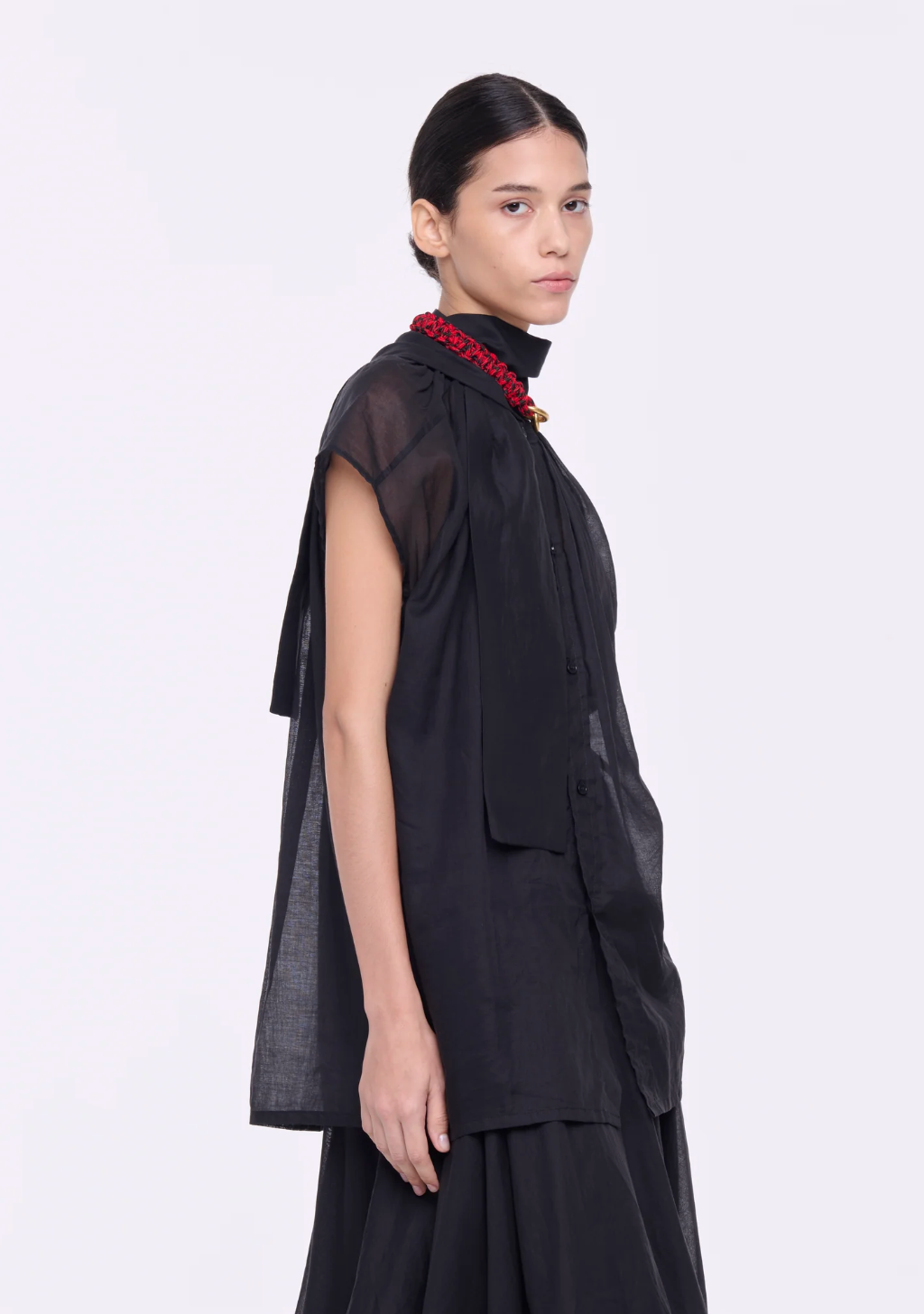 Cotton organza top with removable scarf. Round neck with smock stitch details, front button closure. Sleeveless. Elongated split hem. Mid lenght and loose fit.