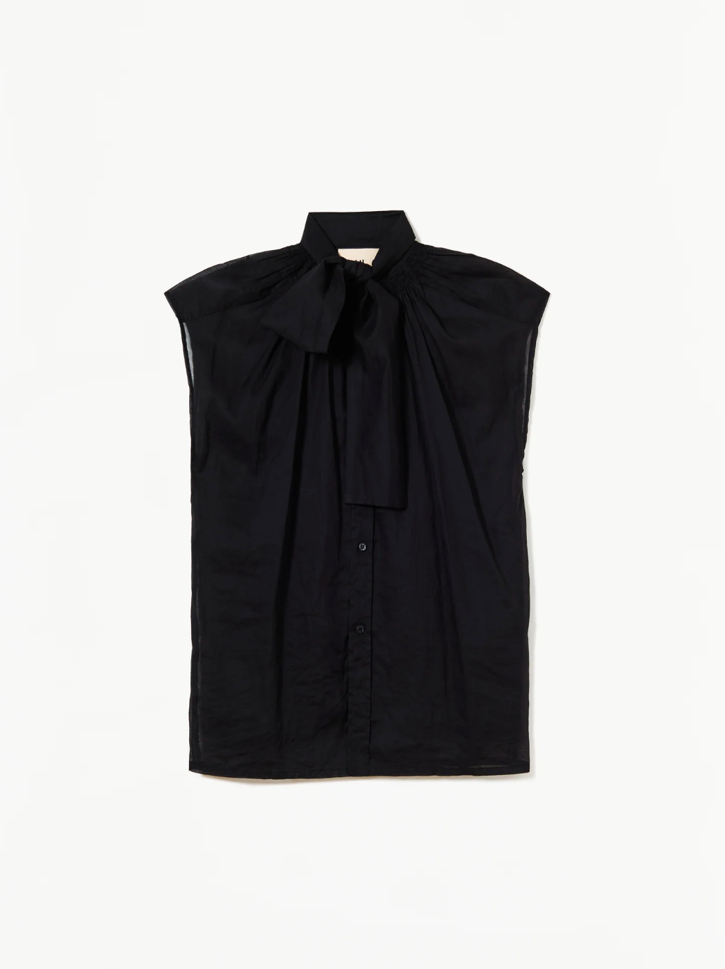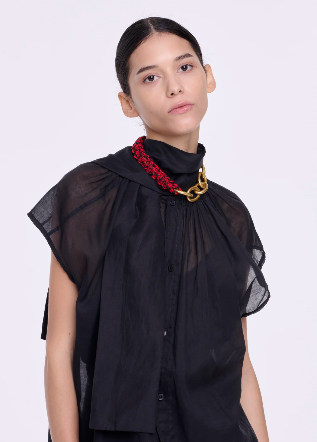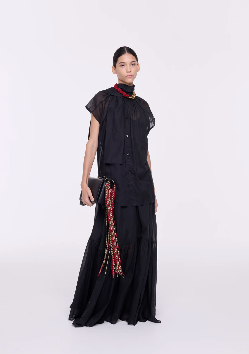 Cotton organza top with removable scarf. Round neck with smock stitch details, front button closure. Sleeveless. Elongated split hem. Mid lenght and loose fit.