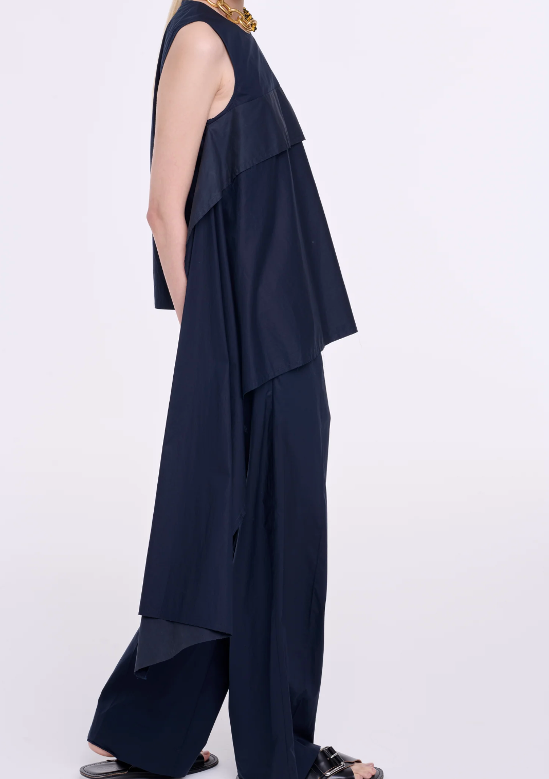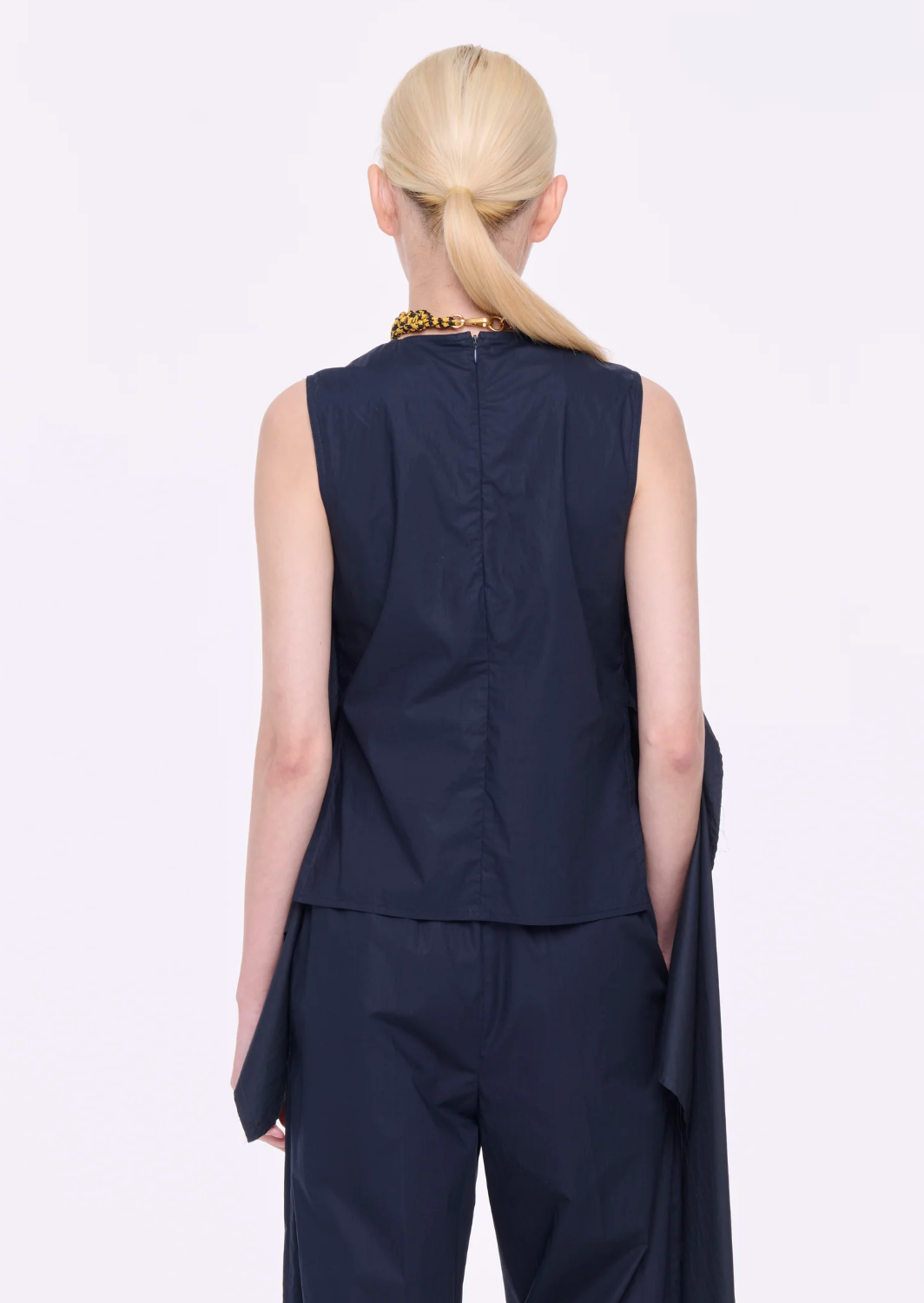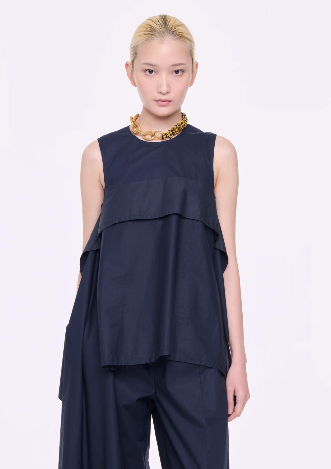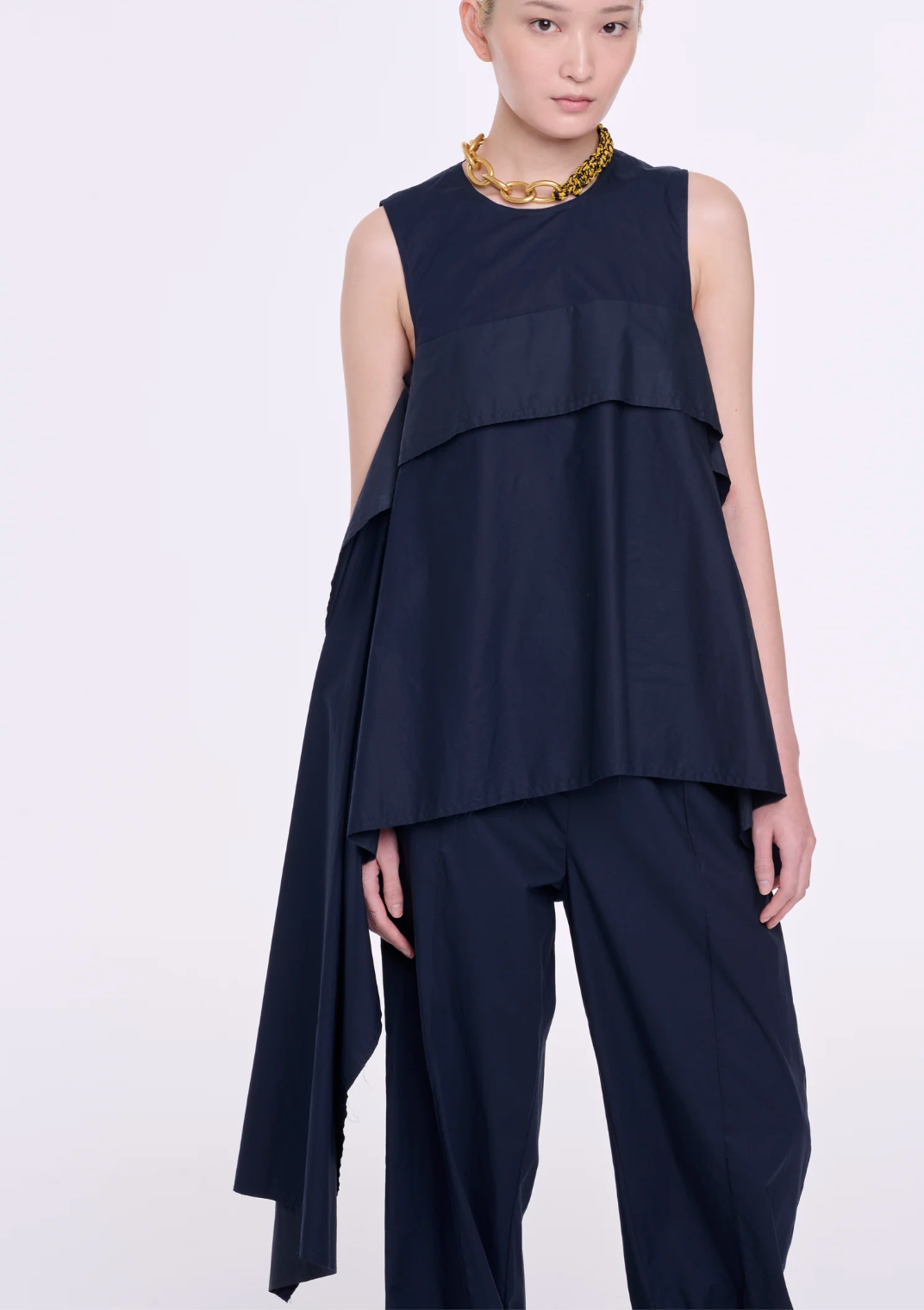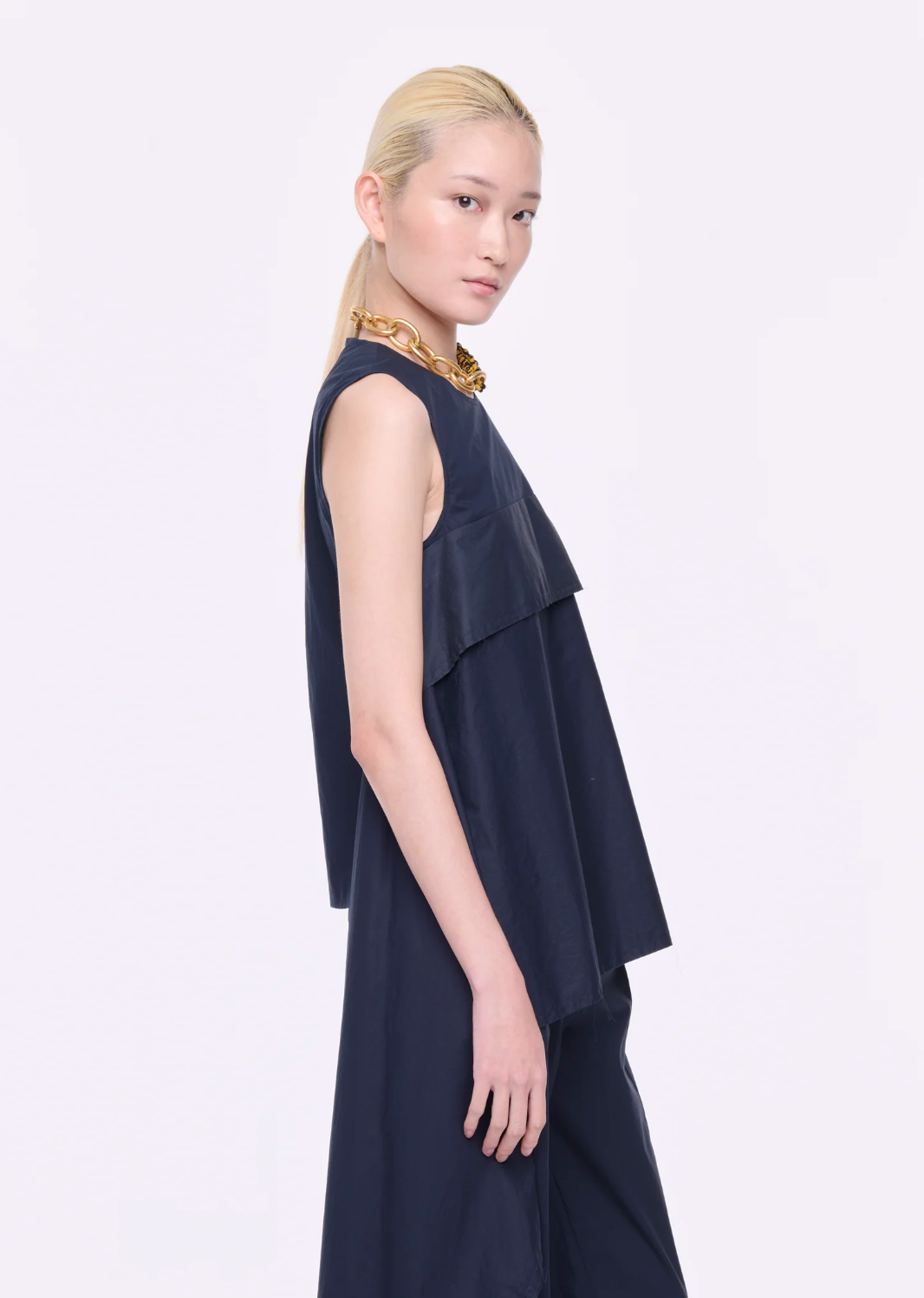Blue round-neck top in water resistent parachute cotton. Side asymetric panel and front single ruffle.