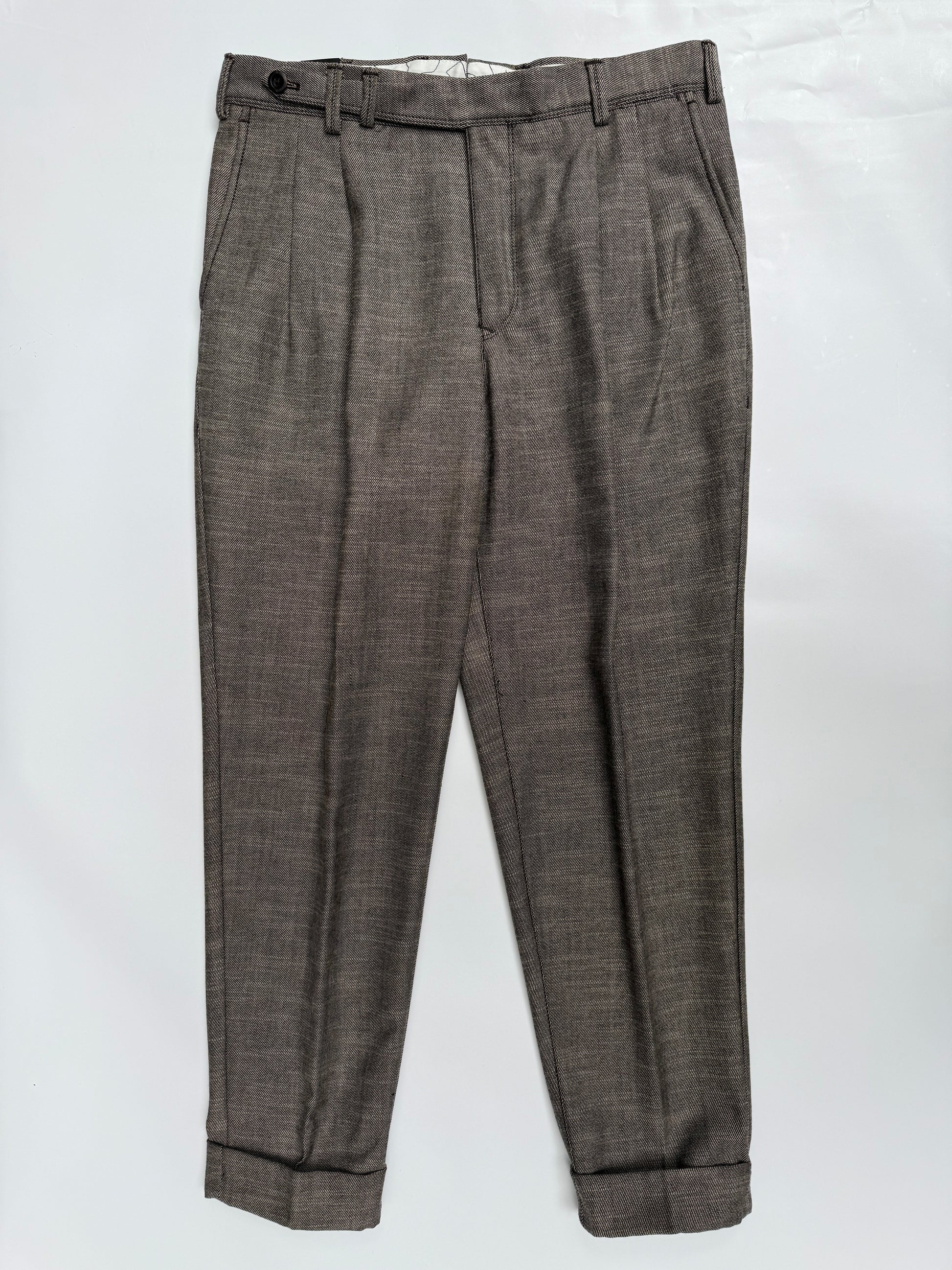 These brown melange cabardine trousers feature a crisp front pleat and a turned-up cuff for a classic, tailored look. Crafted for comfort and style, they offer a versatile addition to your wardrobe.